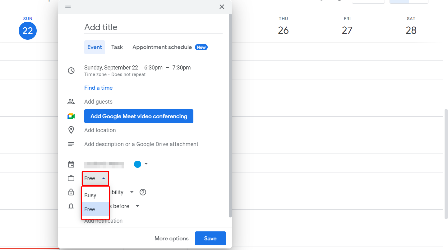 Q: How do I change an event from 'free' to 'busy' in Google Calendar?