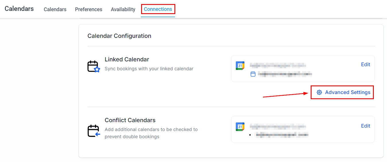 You'll encounter various “Sync Options” when setting up or editing your calendar. These will decide how the calendar behaves when synchronizing system calendar events with the external calendar you're connecting. Understanding these options is key to optimizing your calendar integration. To access these settings go to the Connections tab inside the Calendars section under Settings then click Advanced Settings under Calendar Configuration.