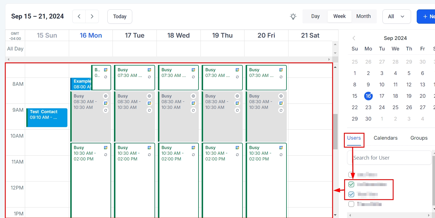 On the right-hand side of the screen, locate the "Users" section. Select the checkboxes next to the names of the individuals whose calendars you wish to compare.