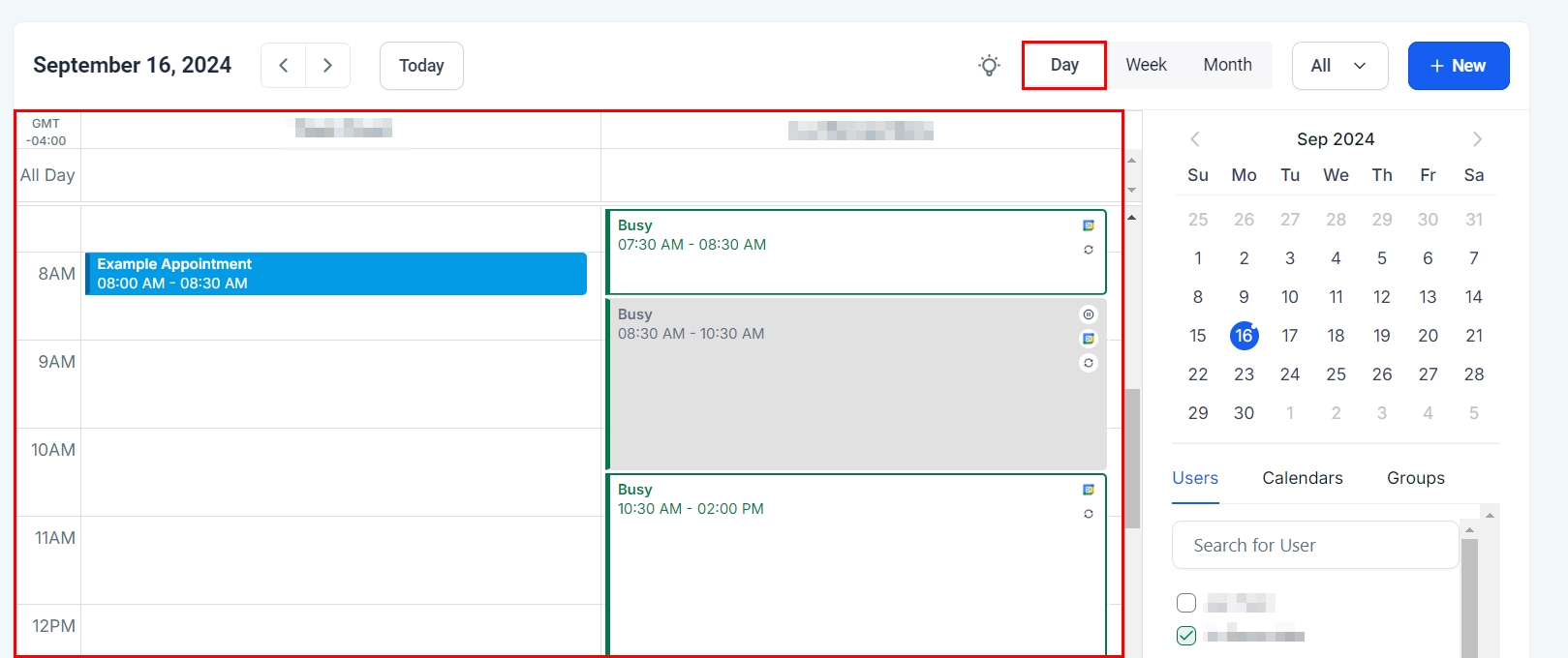 After selecting the desired calendars, click on the "Day" tab from the menu. The chosen calendars will be displayed side by side in the resource view, facilitating easy comparison and scheduling.