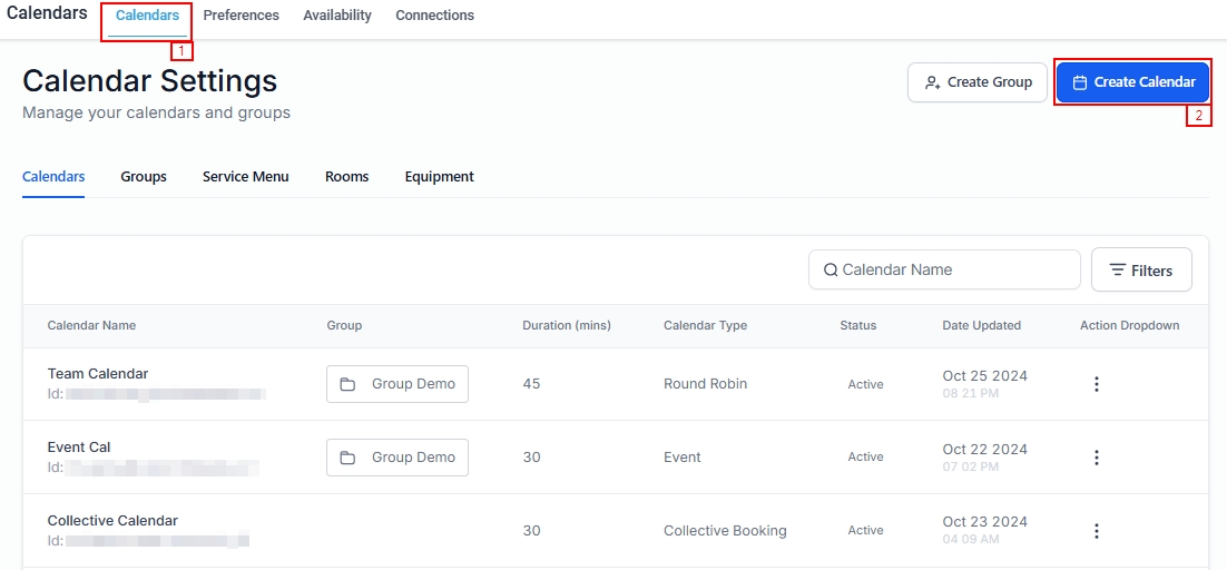 To create a calendar, first access the Calendar Settings within your account. Navigate to the Calendar tab, and click on "Create Calendar" to start setting up a new calendar.