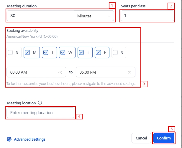 For Meeting Duration, specify the duration of each appointment to ensure proper scheduling and time management. Next, set the number of attendees for each class. For example, if you set the maximum number of seats per class to 10, then up to 10 invitees can book a single time slot. 📌NOTE: You can choose a maximum of 9,999 attendees in a single slot; however, if you use a conferencing tool, the tool may have a different maximum attendees limit. For example, Zoom offers a maximum of 500 attendees for certain licenses.