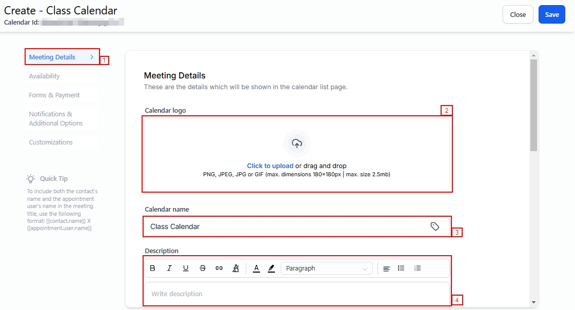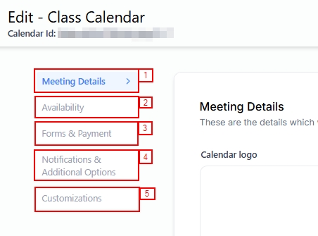 The Meeting Details section allows you to design and enhance the functionality of the Calendar List Page by adding important details such as the Logo, name, description, meeting location of your appointments, and much more.