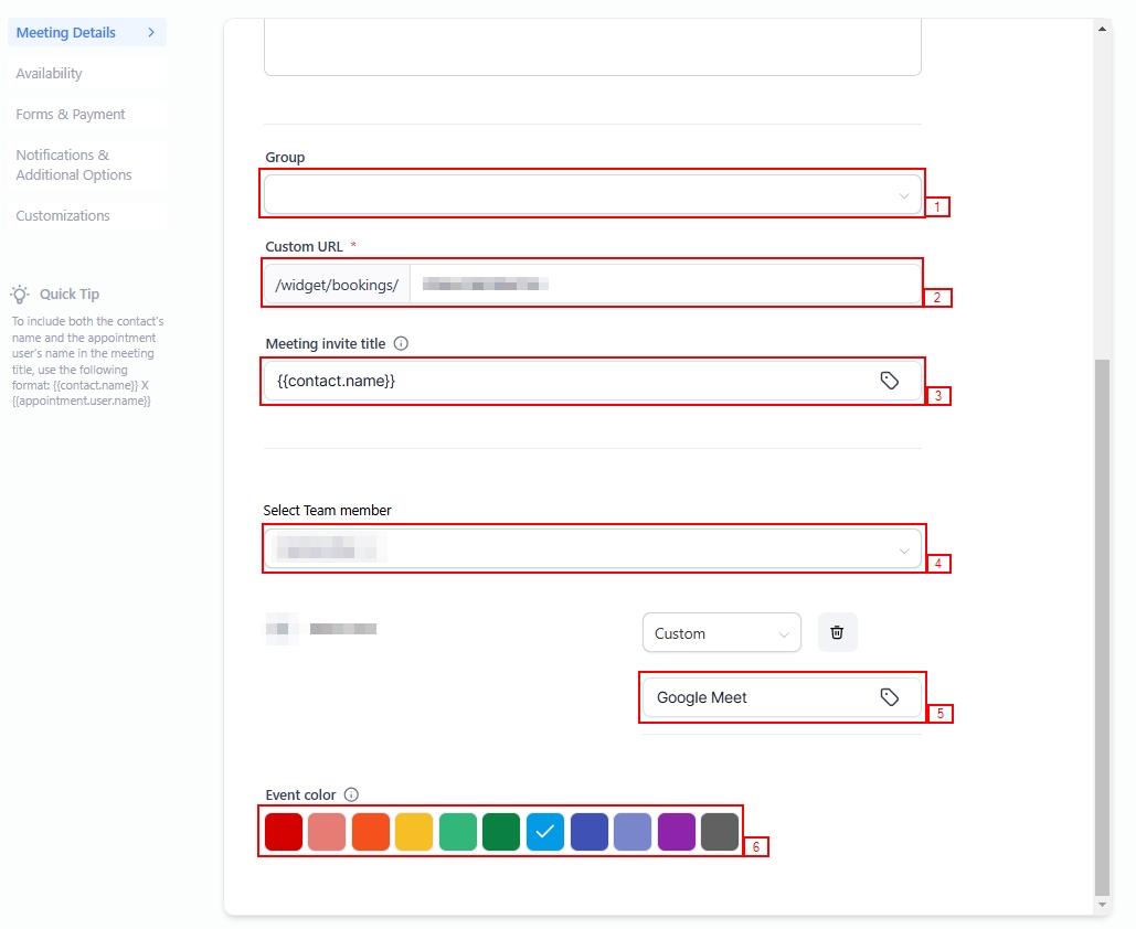 The Meeting Invite title will appear in your calendar and confirmation emails. In the select team member dropdown, adjust the user who should conduct the meetings from the dropdown menu and configure the meeting location.