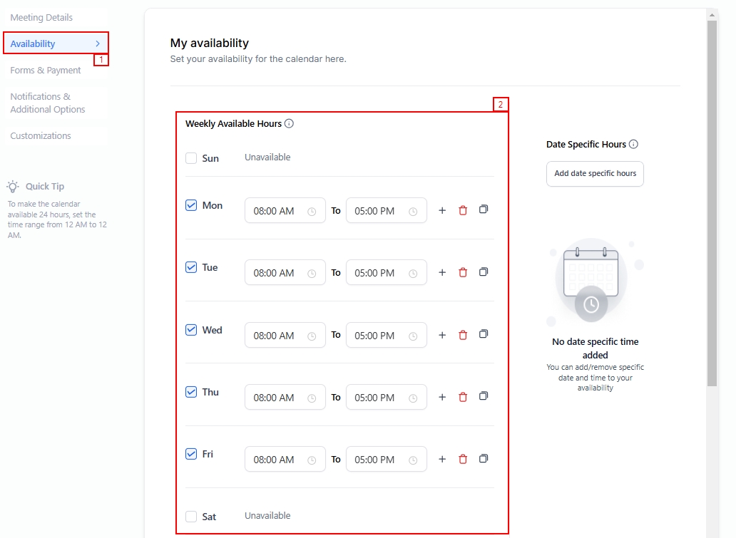In the Availability section, select the boxes beside the dates to indicate the days available for booking. Then, set the corresponding time slots.