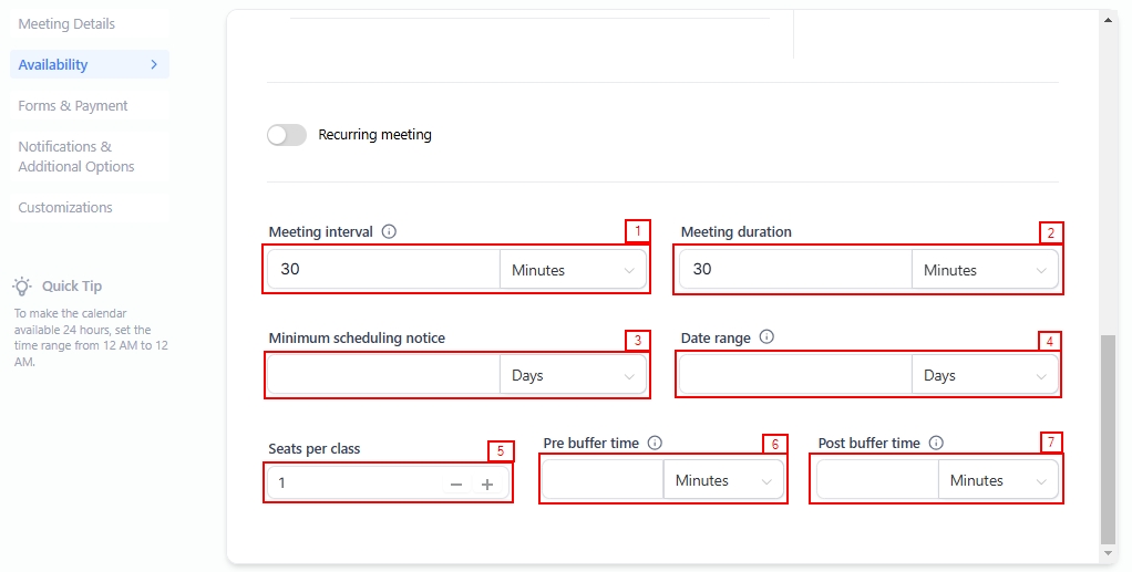 Adjust the Meeting Interval if recurring meetings are disabled. This setting defines the time between available slots; for example, a 30-minute interval displays slots at 10:00 am, 10:30 am, and so on.