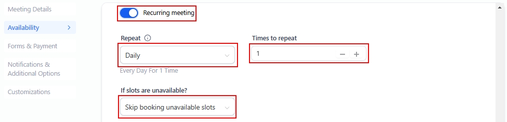 Toggle on recurring meetings to set the desired frequency for the appointment and the total number of consecutive occurrences. For unavailable time slots, you can choose to skip those slots, reschedule the appointment in the next available slot, or continue booking regardless of availability.