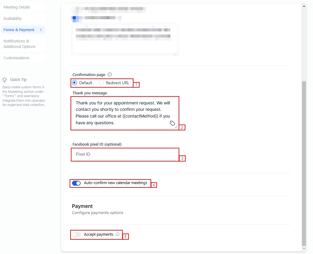 In the Forms & Payment tab you can set how to collect information from contacts booking appointments or to gather deposits/fees using the relevant sections.