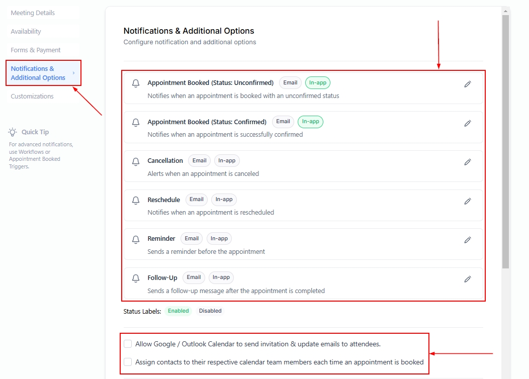 Turn on “Assign Contacts to Their Respective Calendar Team Members Each Time an Appointment Is Booked” to assign the contact to a specific team member when an appointment is booked. It helps in linking attendees directly to the appropriate team member handling the session.