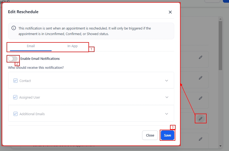 To edit the pre-written notifications click on the pencil icon on your preferred notification to configure email notifications and set up In-app alerts. Click the Save button to apply your updates.