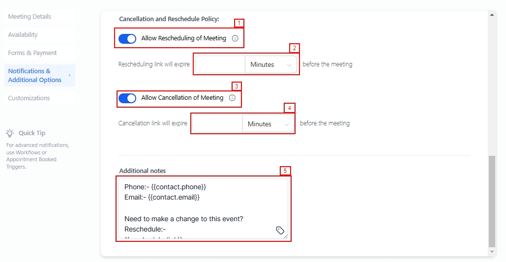 Use the Reschedule Policy toggle to enable or disable participants' ability to reschedule meetings. When activated, participants can reschedule within a timeframe defined by the Rescheduling Link Expiry, which specifies how long the rescheduling link remains active. This duration can be set in minutes, hours, or days.
