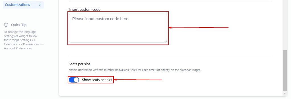 Insert custom code for advanced functionality and toggle on Seats Per Slot to show the number of available spots in the calendar widget.
