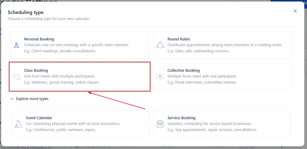 In the pop-up, select Class Booking as the calendar type.