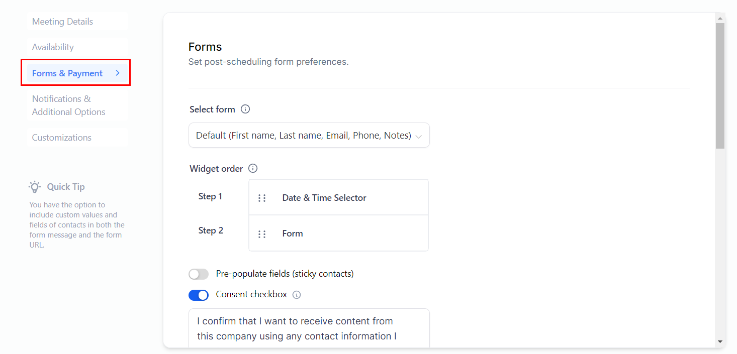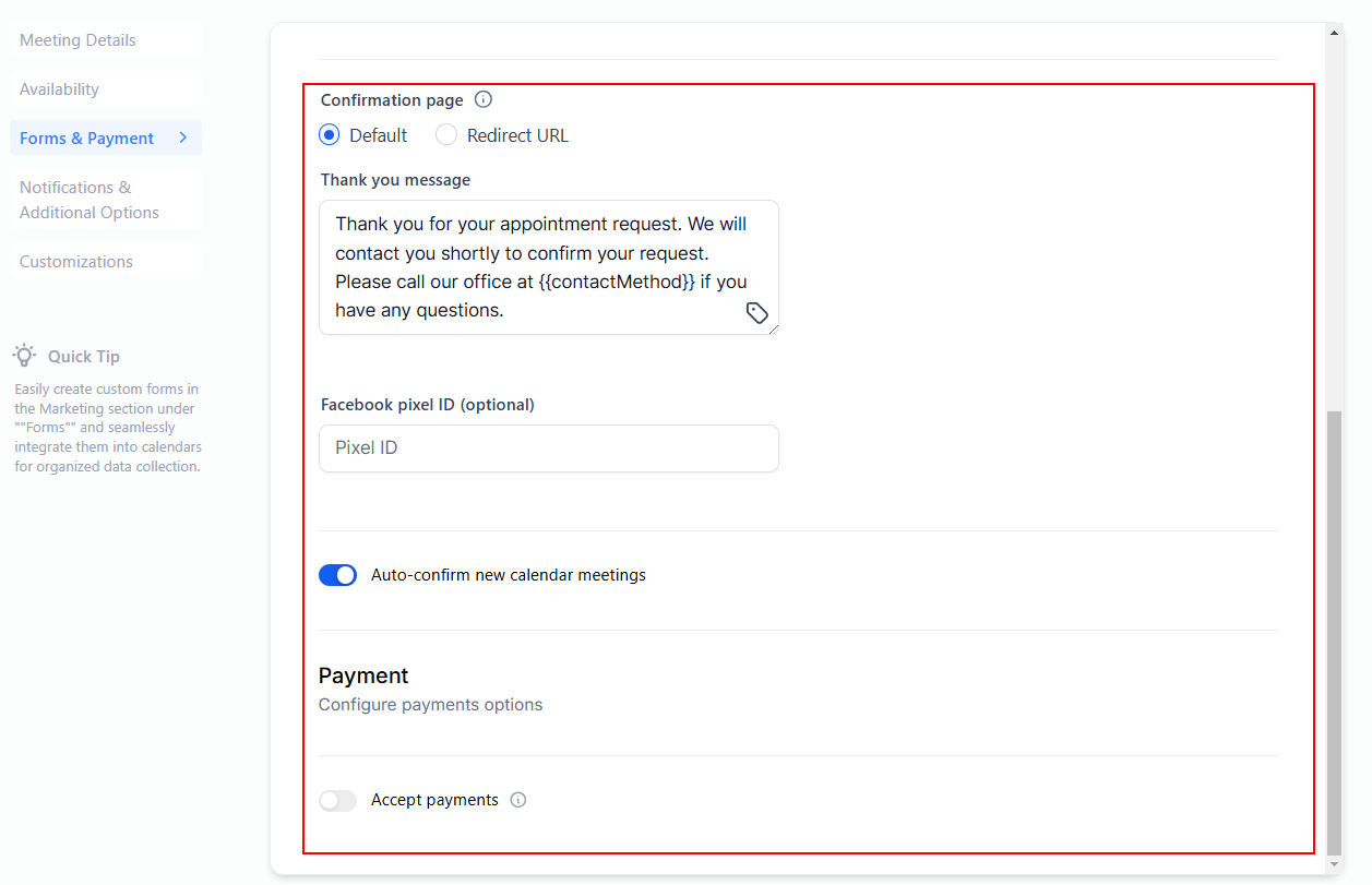 Set the forms you want to use to collect the contact information, and if you want to collect payment for the appointment booking in this section.