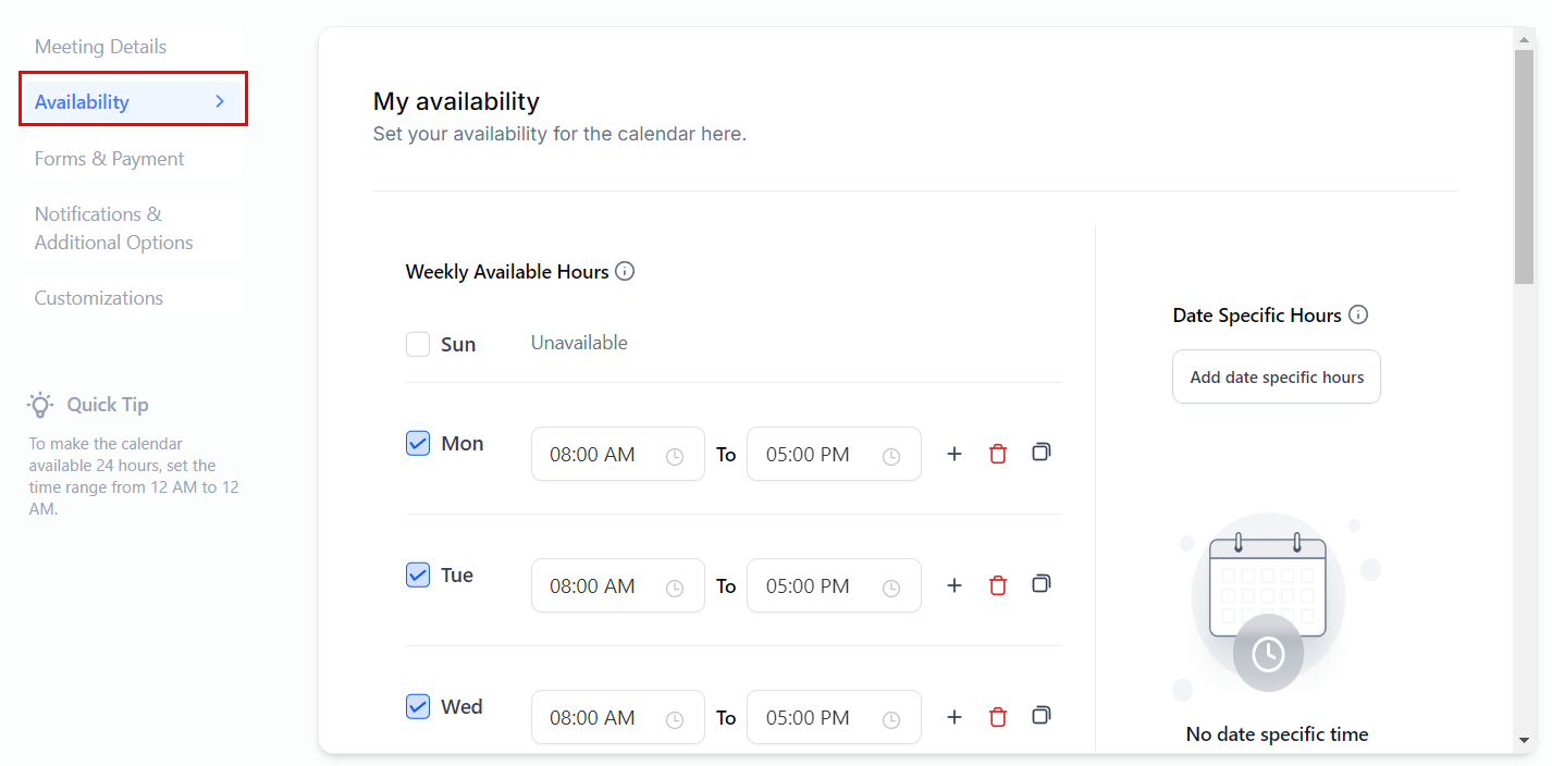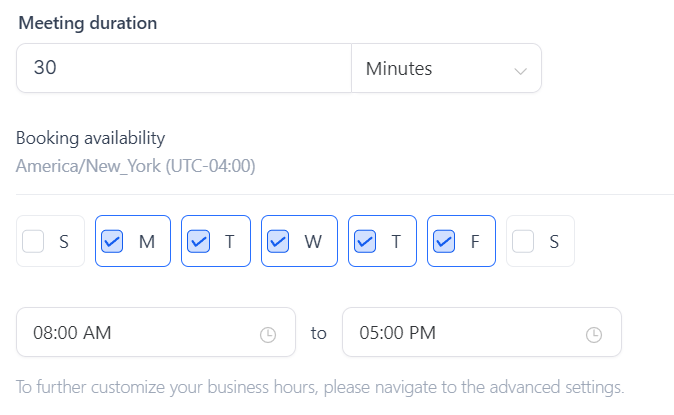 In this section, you can set the specific availability for each day of the week and set the parameters for this meeting type (how often can be booked, how long it lasts, etc.)