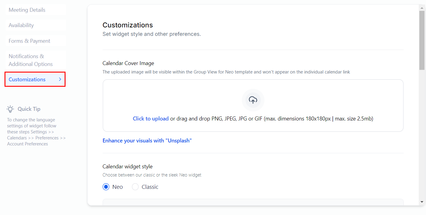Here you can change the name, URL, and Meeting invite title of the calendar, as well as add logos, team members, and a description of the calendar.