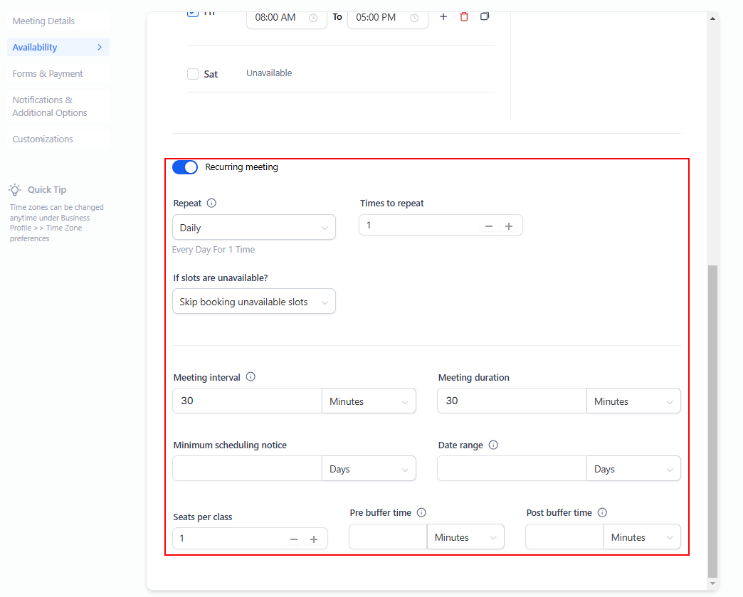 Scroll down to add recurring meeting details, meeting time, meeting duration, and much more.