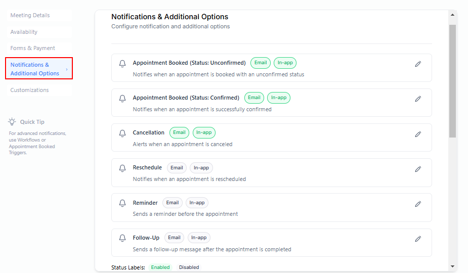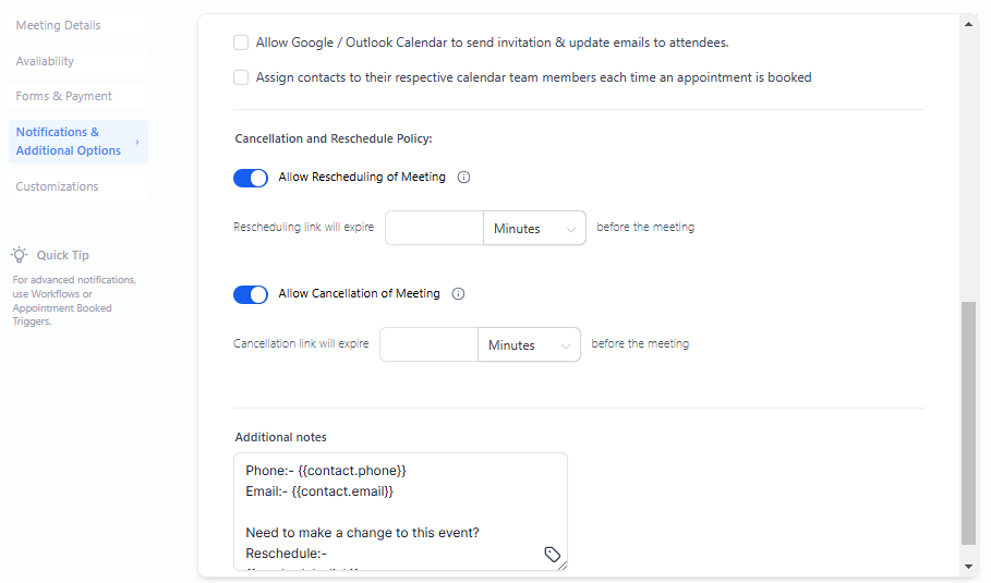 You can set the notification type and recipients, your cancelation and rescheduling policies, and any additional notes.