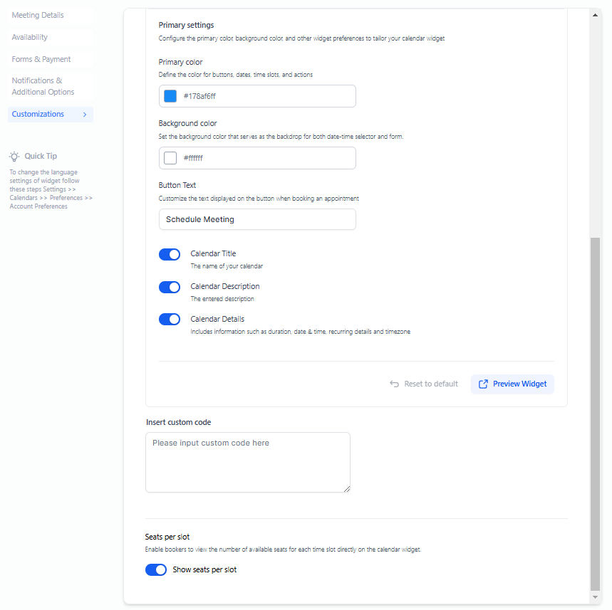 This section is dedicated to the calendar's appearance, so here you can change the colors, add code, or the text shown.