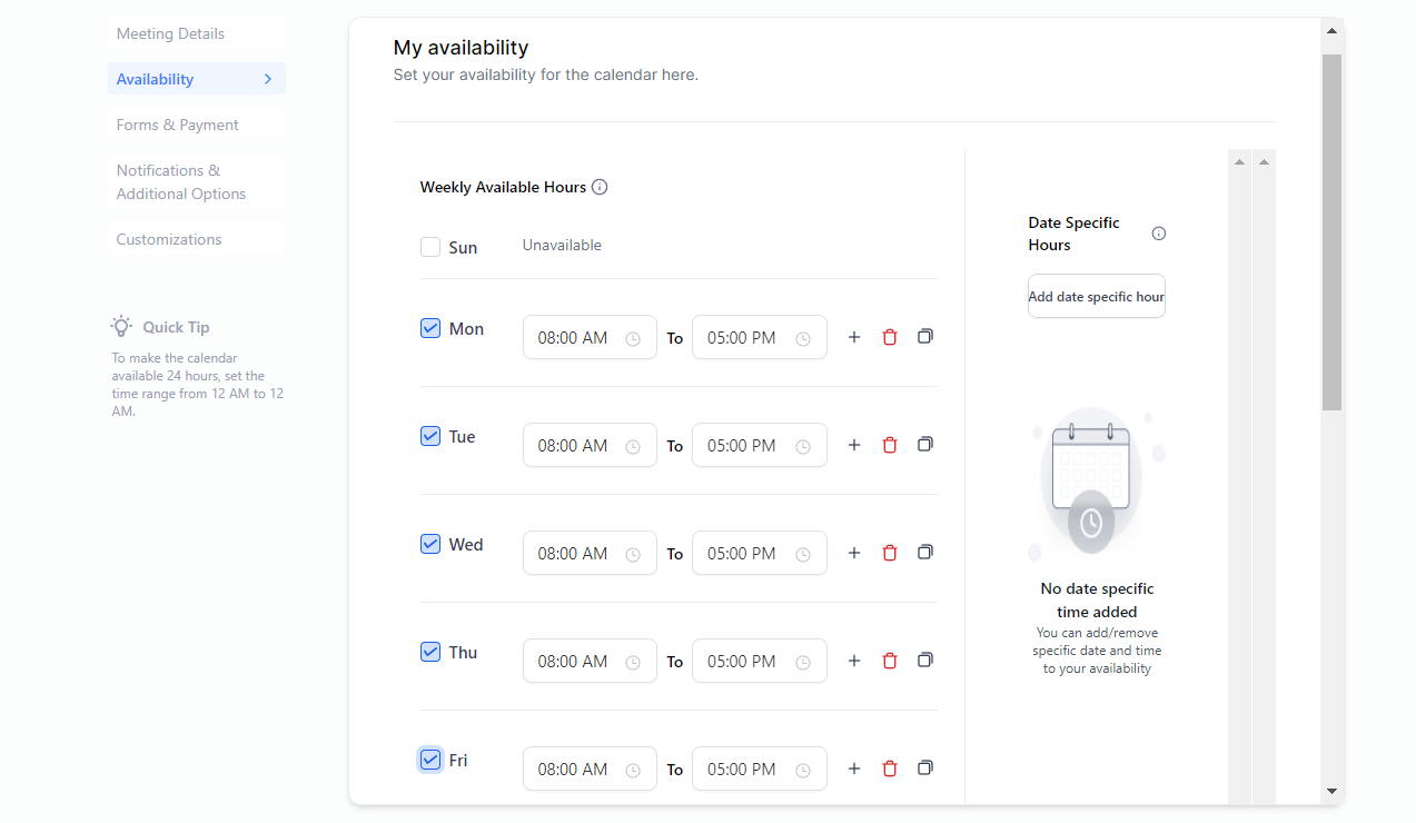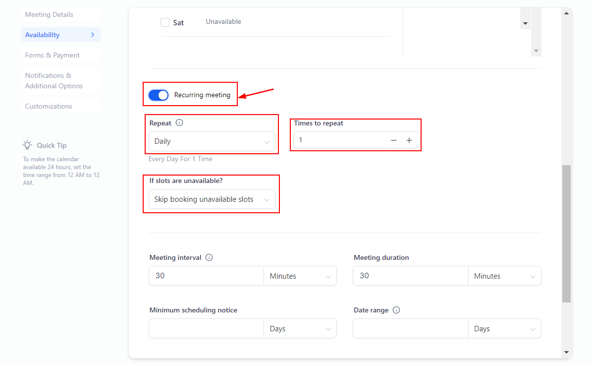 Meeting Interval: This will be the frequency for available time slots. For example, if you have a 30-minute slot interval, then your time slots will show availability every 30 minutes (10:00 am, 10:30 am, 11:00 am, etc.)