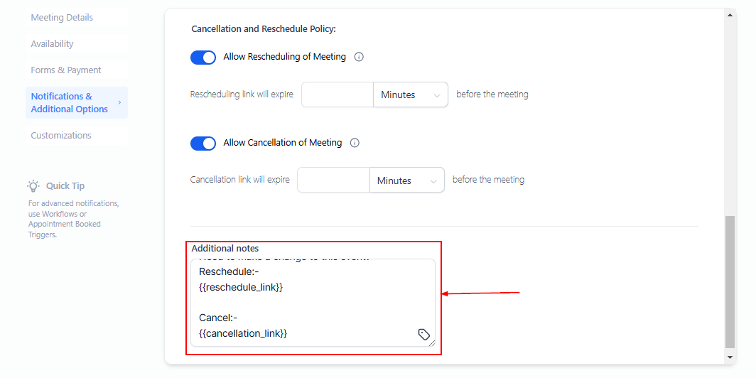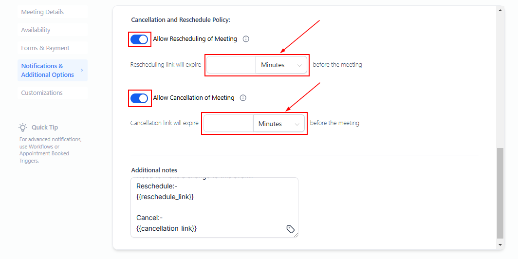 Cancellation and Reschedule Policy: If the option is toggled on the system automatically adds a link for the contacts to handle the rescheduling or cancelation, this link can be removed by toggling the button off. Additionally, you can give this link an expiration window limiting how soon it can be used before the appointment.
