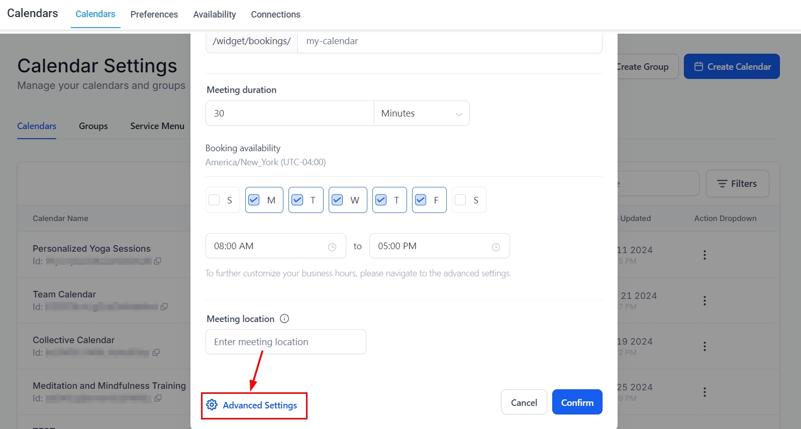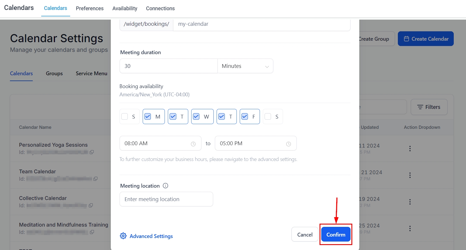 After choosing the Calendar group, you'll be directed to fill out key components of the Calendar configuration such as its name, meeting duration, and booking availability.