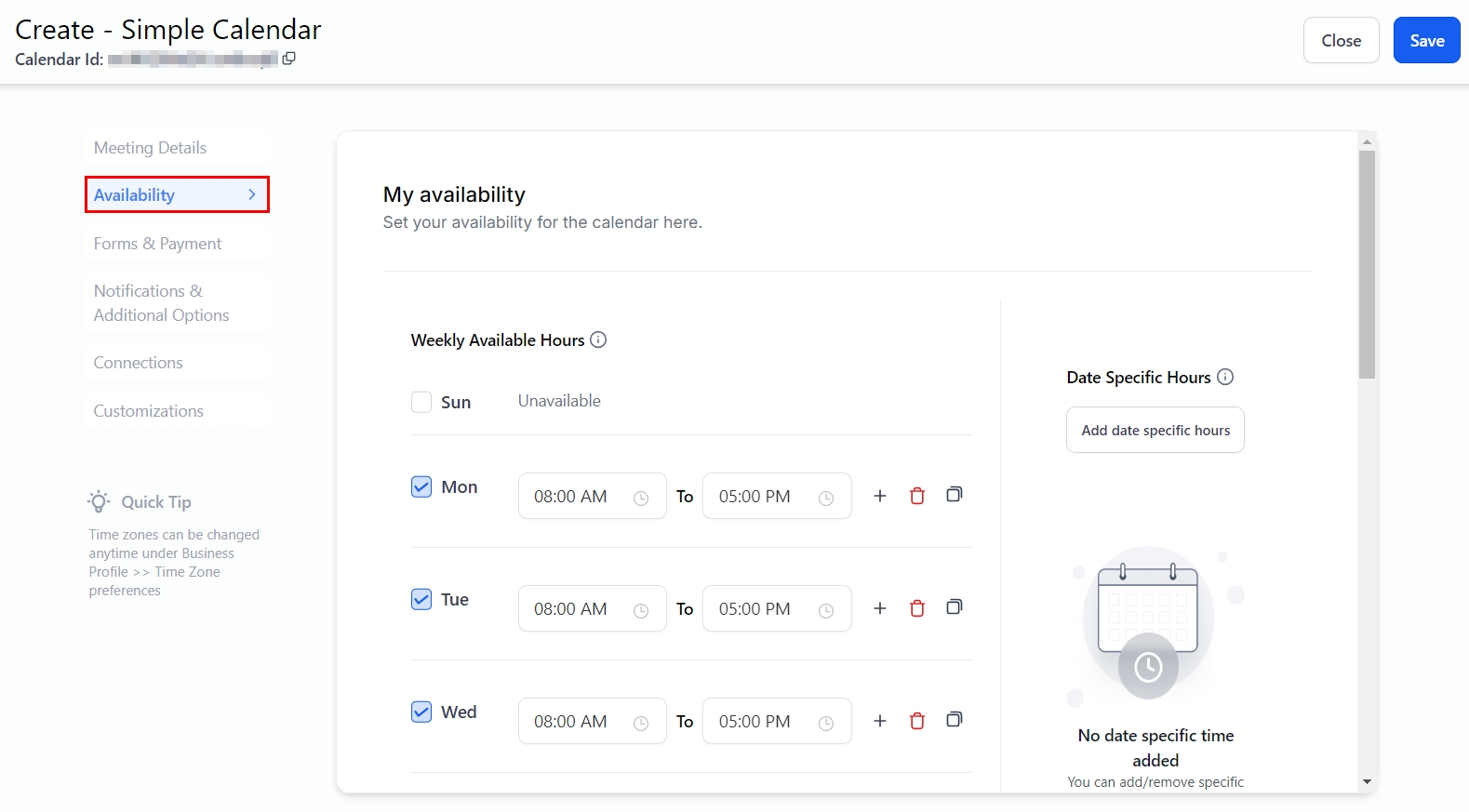 This section manages your calendar's time settings, including the general days and times available for appointments. Here, you can configure the schedule for recurring meetings and adjust settings for when appointment slots are open for booking.