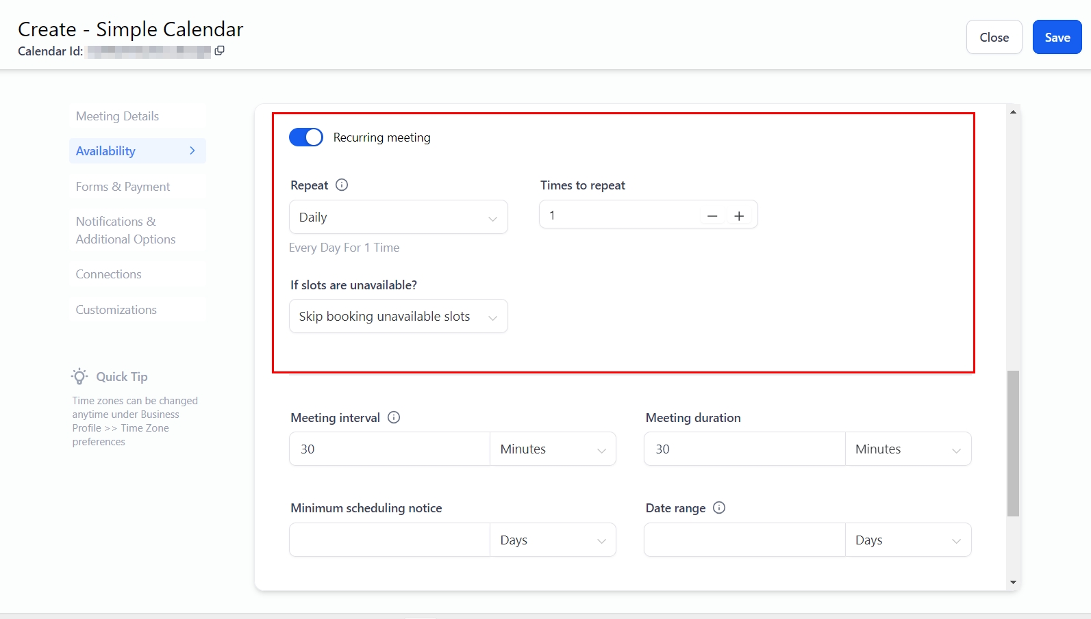 Enable this option for recurring meetings. Set the desired frequency for the appointment and the total number of consecutive occurrences. For unavailable time slots, you can choose to skip those slots, reschedule the appointment in the next available slot, or continue booking regardless of availability.