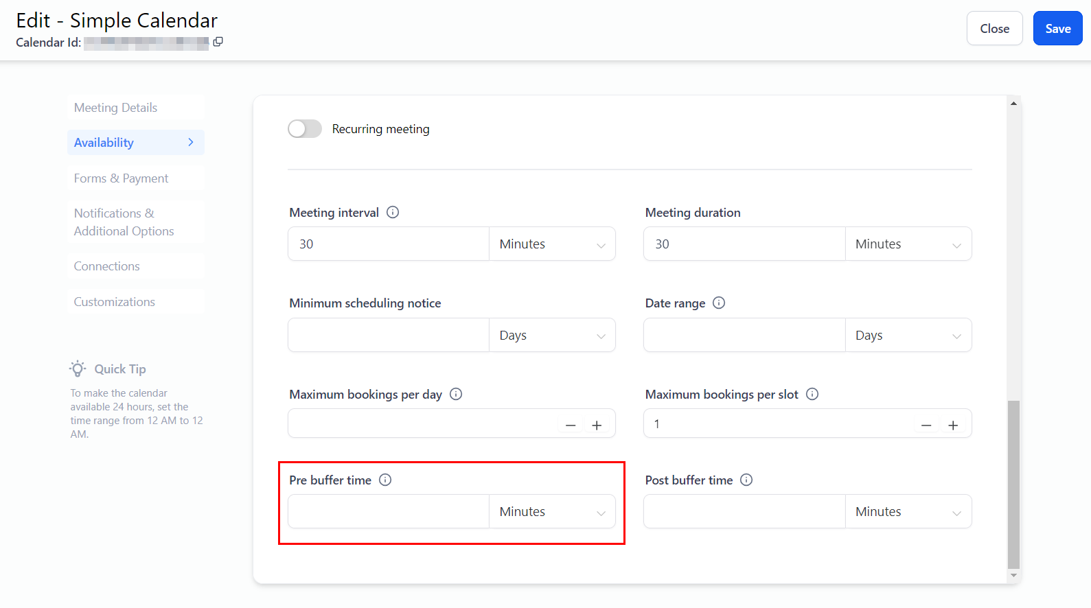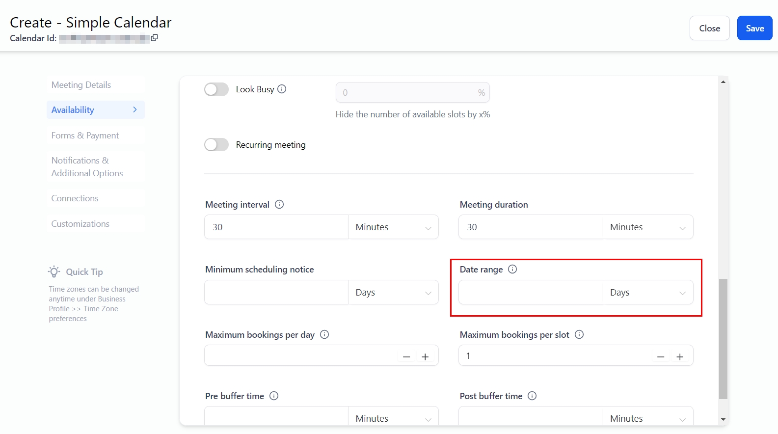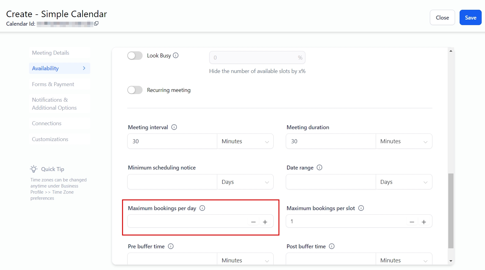 This setting determines the minimum lead time required for booking appointments in your calendar, helping you avoid unexpected meetings. For instance, if you select a 2-day lead time, no one will be able to book a time slot less than 48 hours in advance.