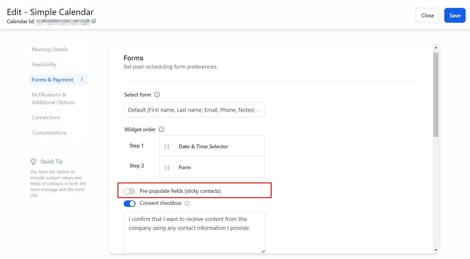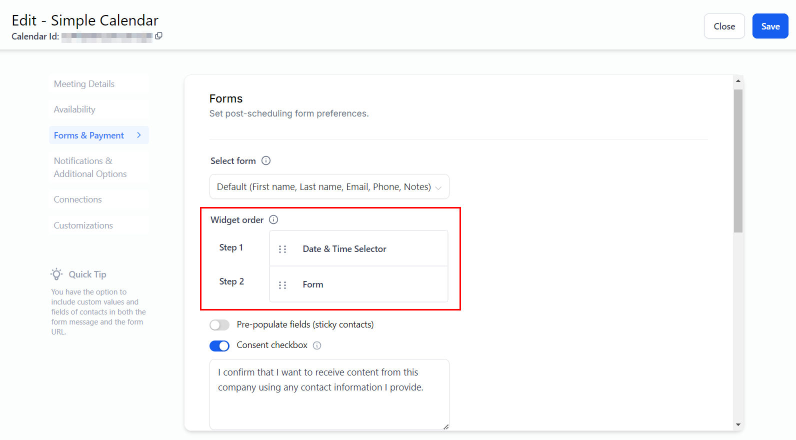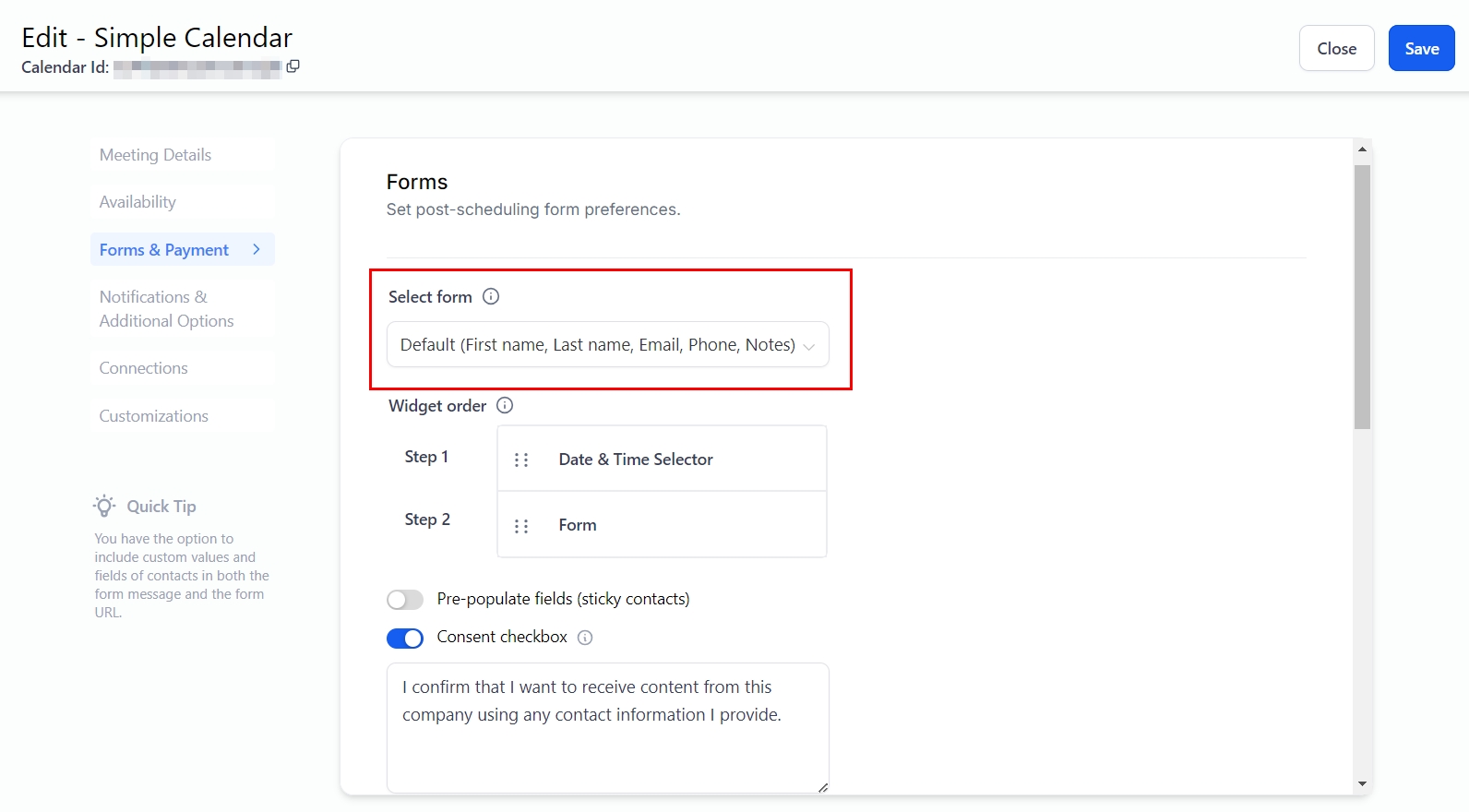 Here, you can choose the form this calendar uses to book the appointment from the dropdown menu.