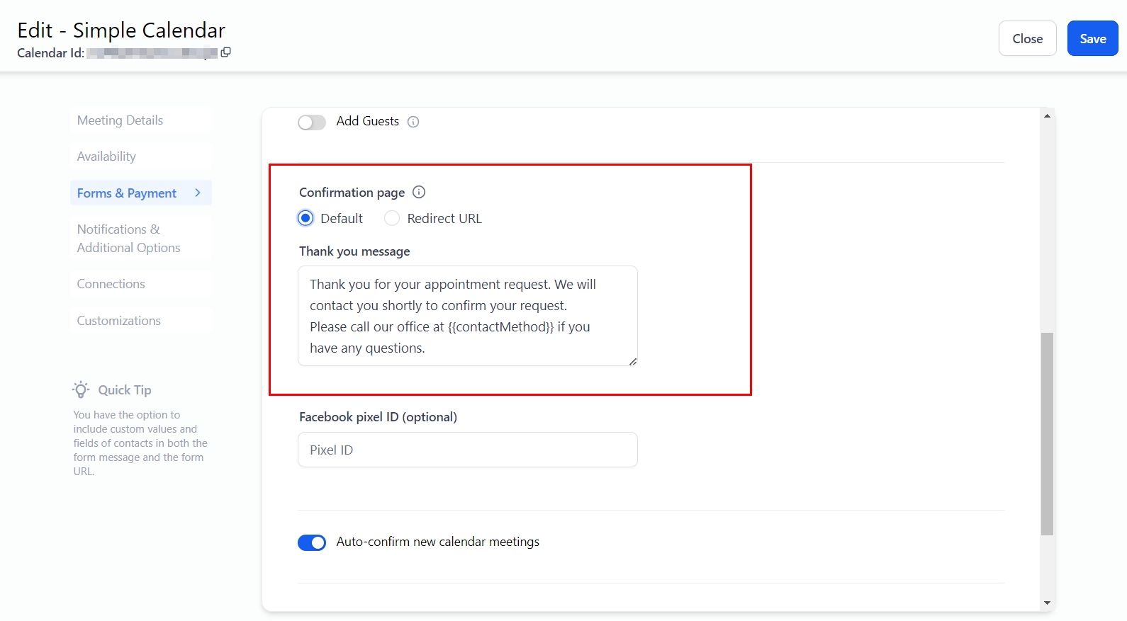 This option determines what is displayed after a booking is made. By selecting "Default," you can set a custom message on the same page. Alternatively, by choosing "Redirect URL," you can direct the contact to a website of your choice.