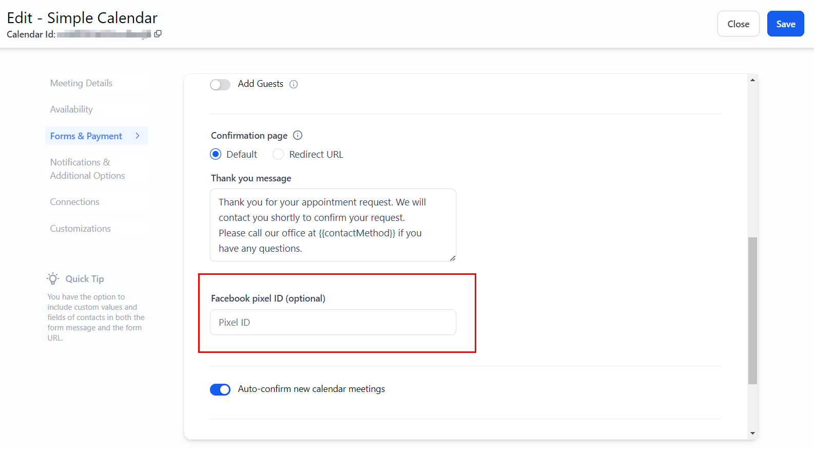 To track new appointment bookings with your Facebook Ads Manager add your Facebook Pixel here.