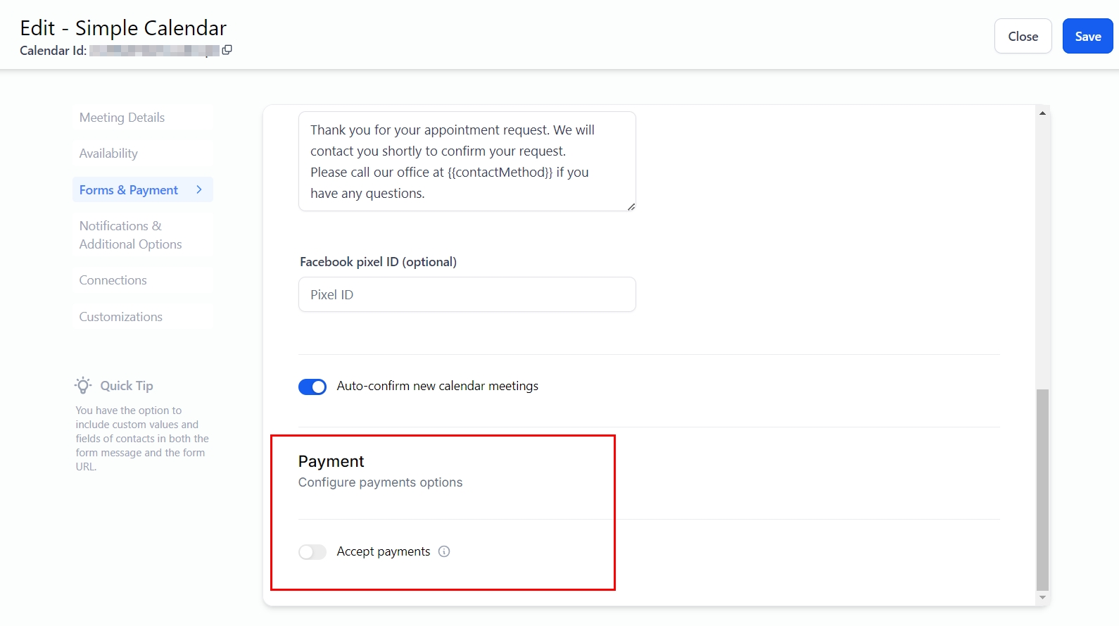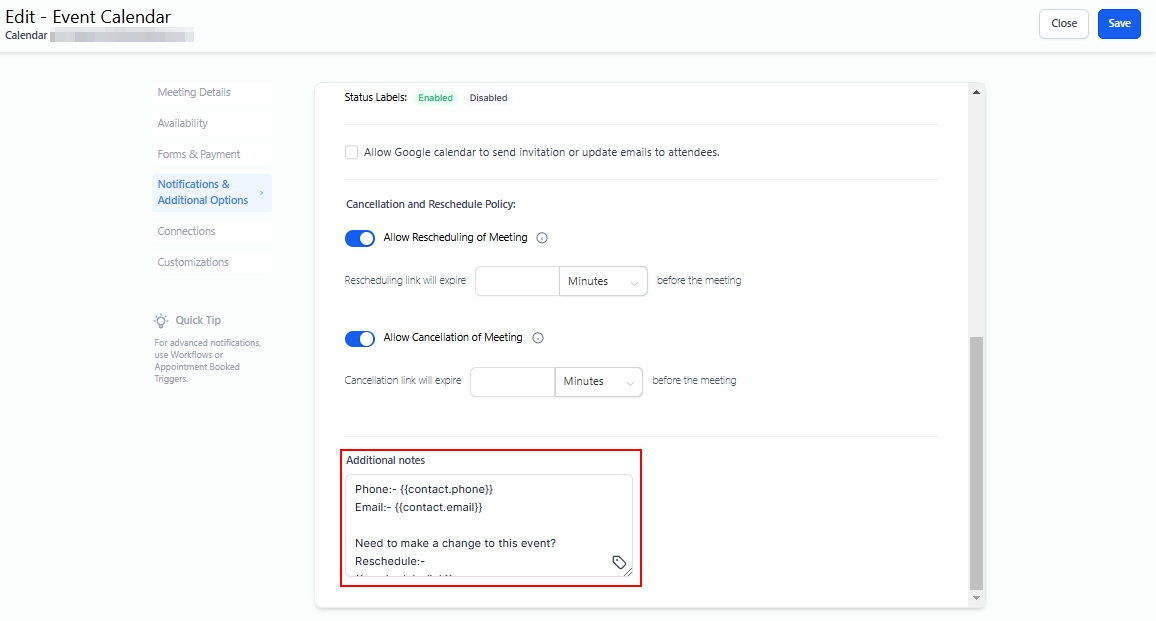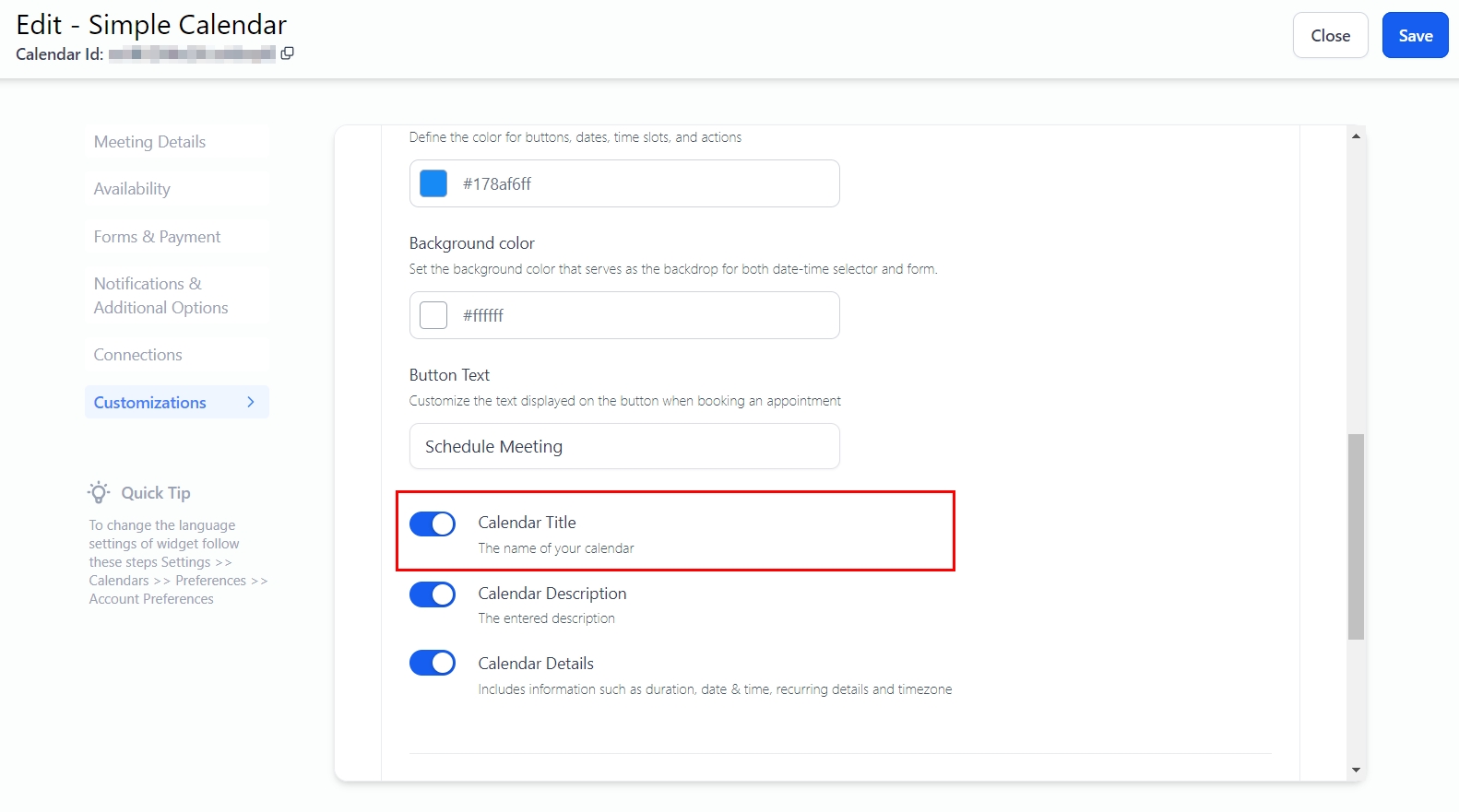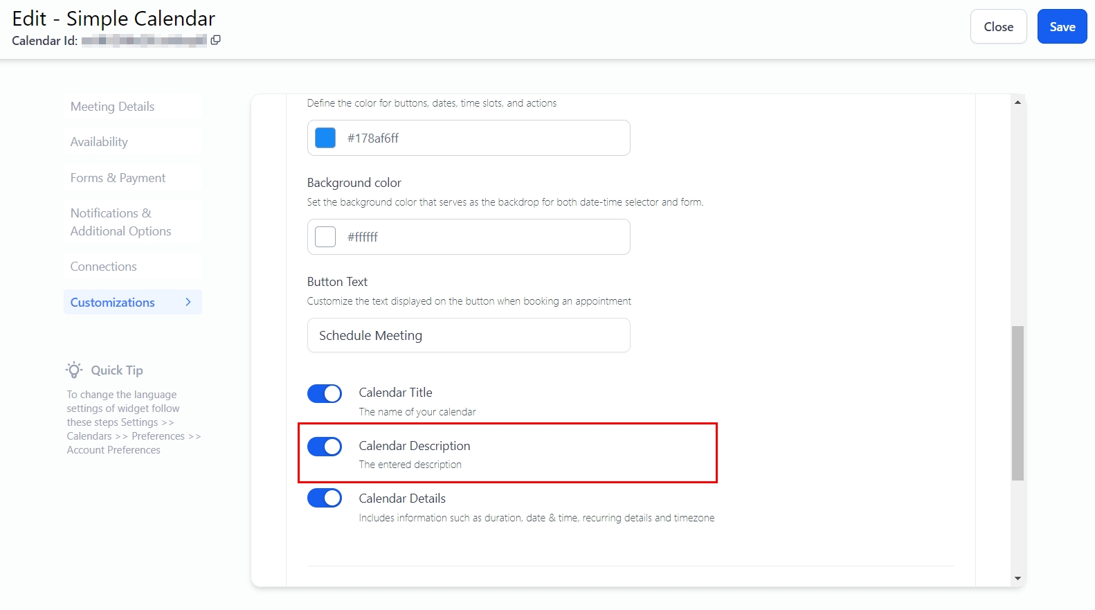 When enabled, calendar information such as the appointment's duration, date and time, recurring details, and time zone settings will be displayed.