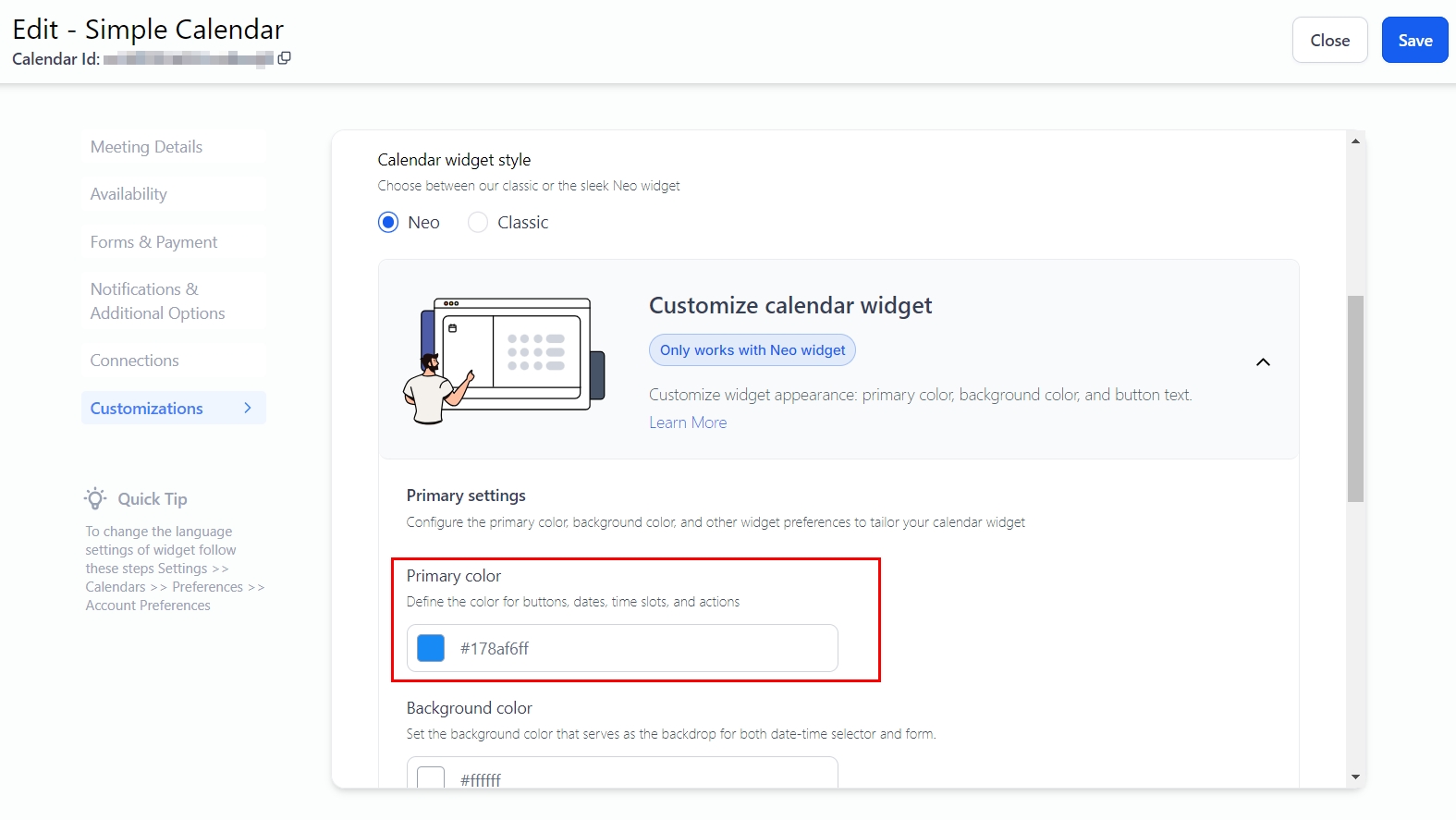Customize the color scheme for buttons, dates, time slots, and actions to align with your brand or personal preferences.