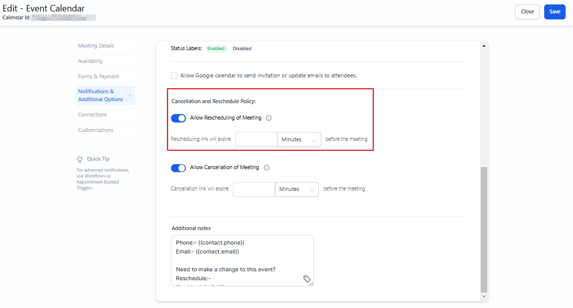 When enabled, a rescheduling link will be included in the additional notes section of the calendar invite. This link will also be added to the calendar invite itself. It will expire according to the configured time before the meeting starts, preventing the booker from rescheduling the meeting after this period.
