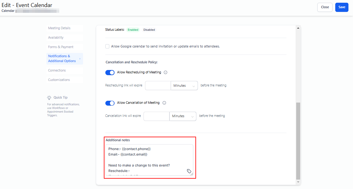 When enabled, a cancellation link will be added to both the additional notes section and the calendar invite. This link will expire based on the configured time before the meeting starts, preventing the booker from canceling the meeting after this period.