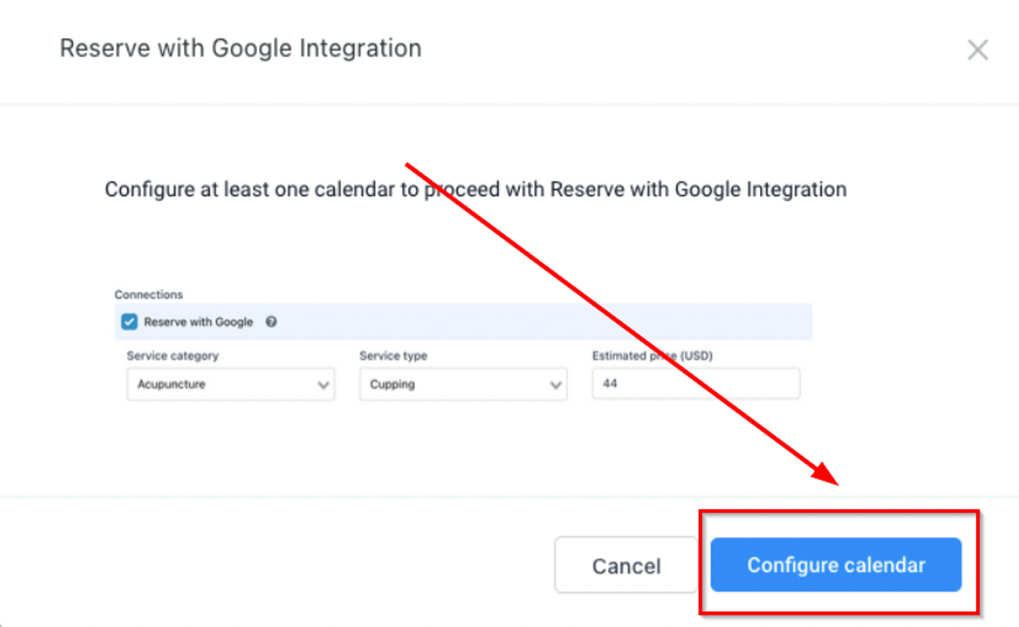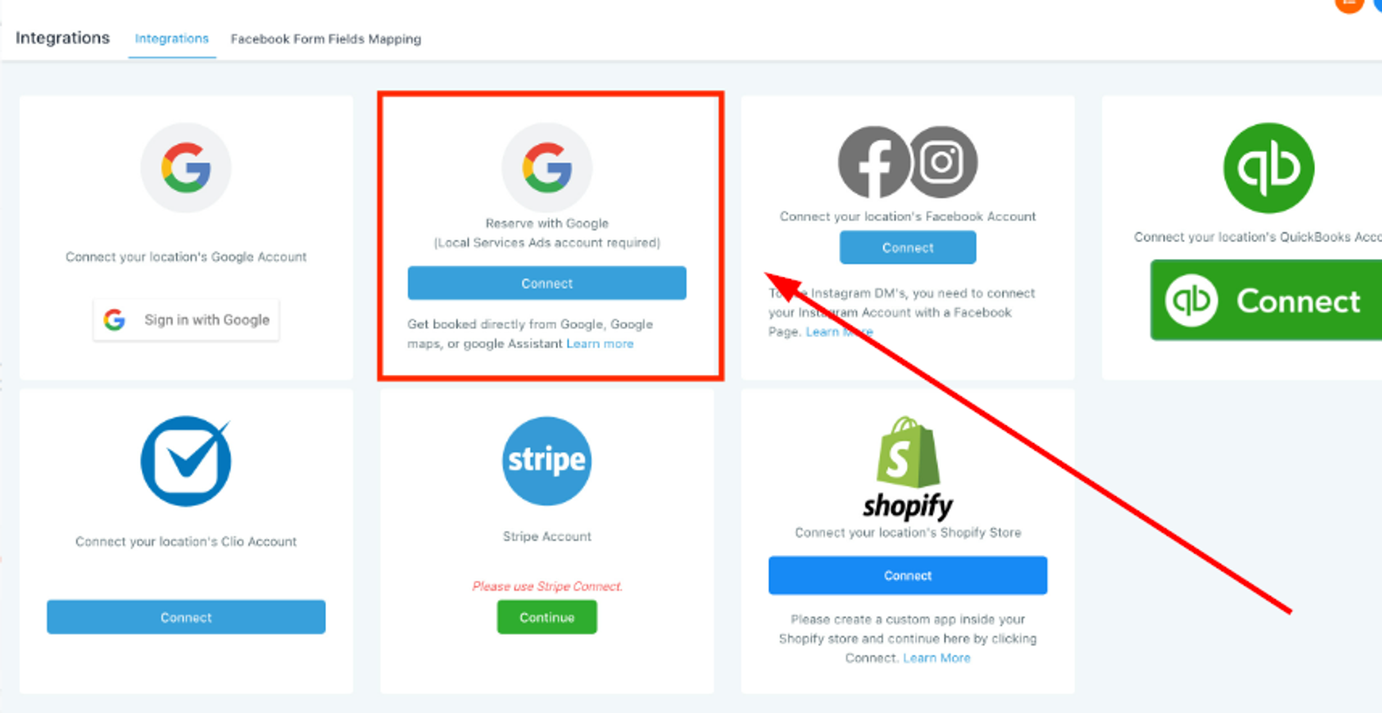 In Settings > Integrations, click "Connect" under Reserve with Google.