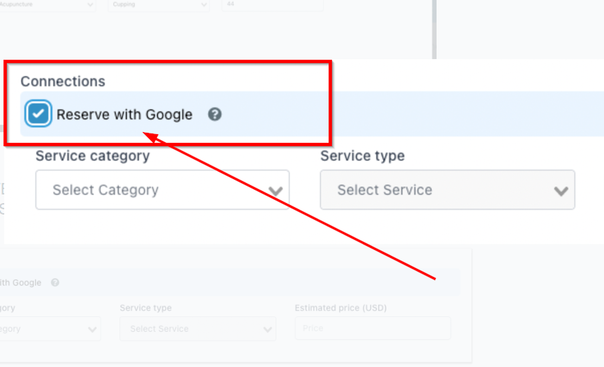 Enable "Reserve with Google," update Service Category, Service Type, and Estimated Price.