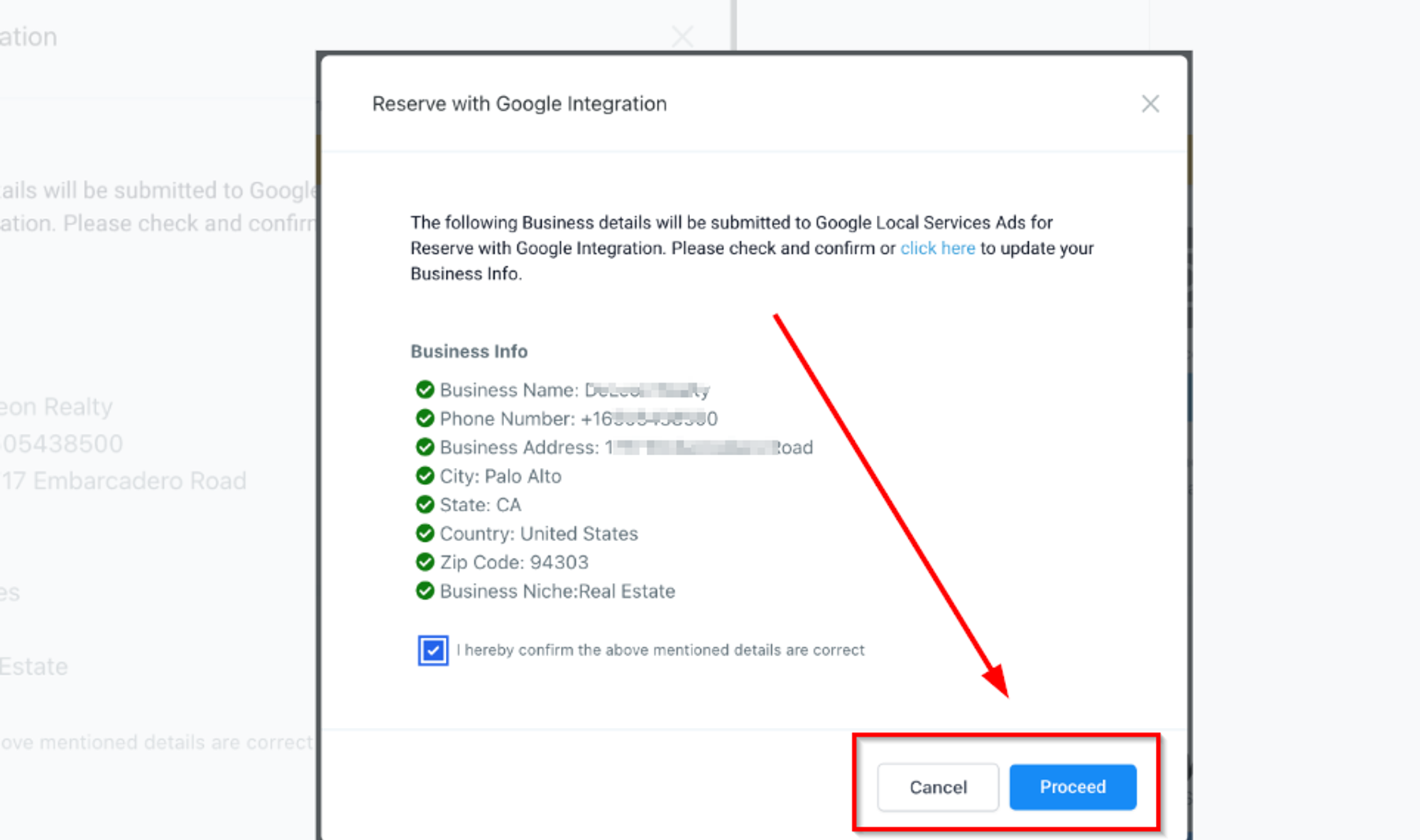 Confirm business details and click "Proceed."