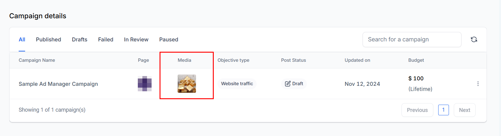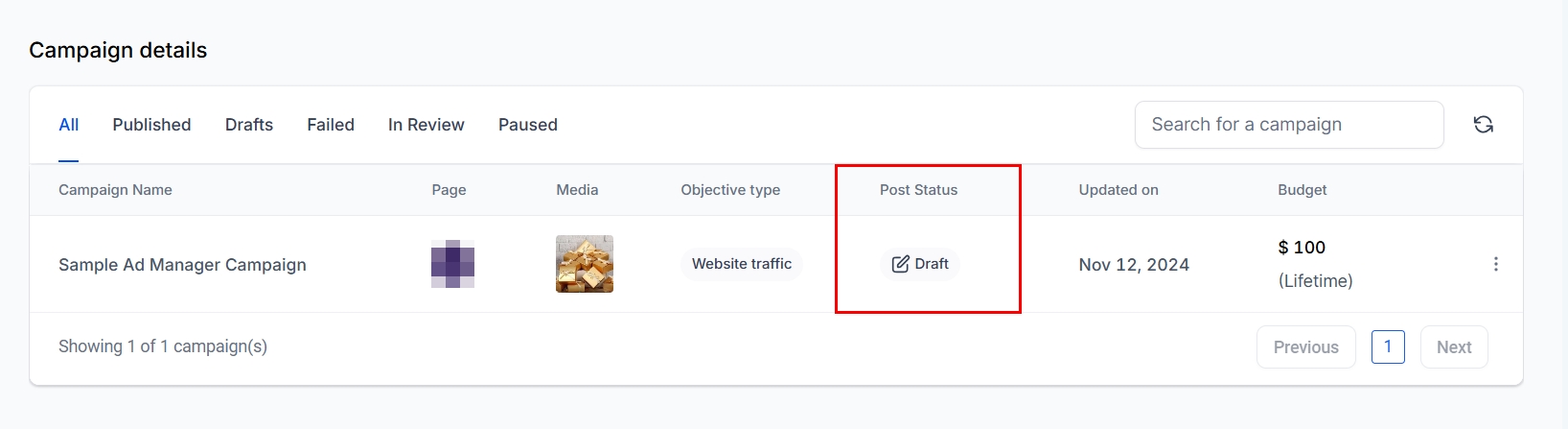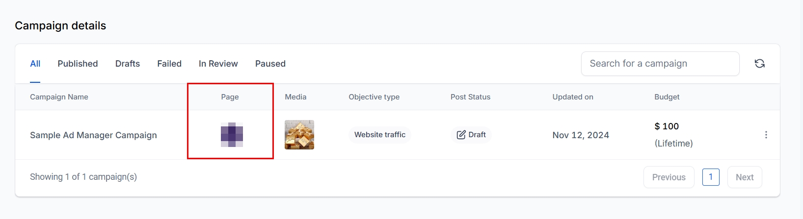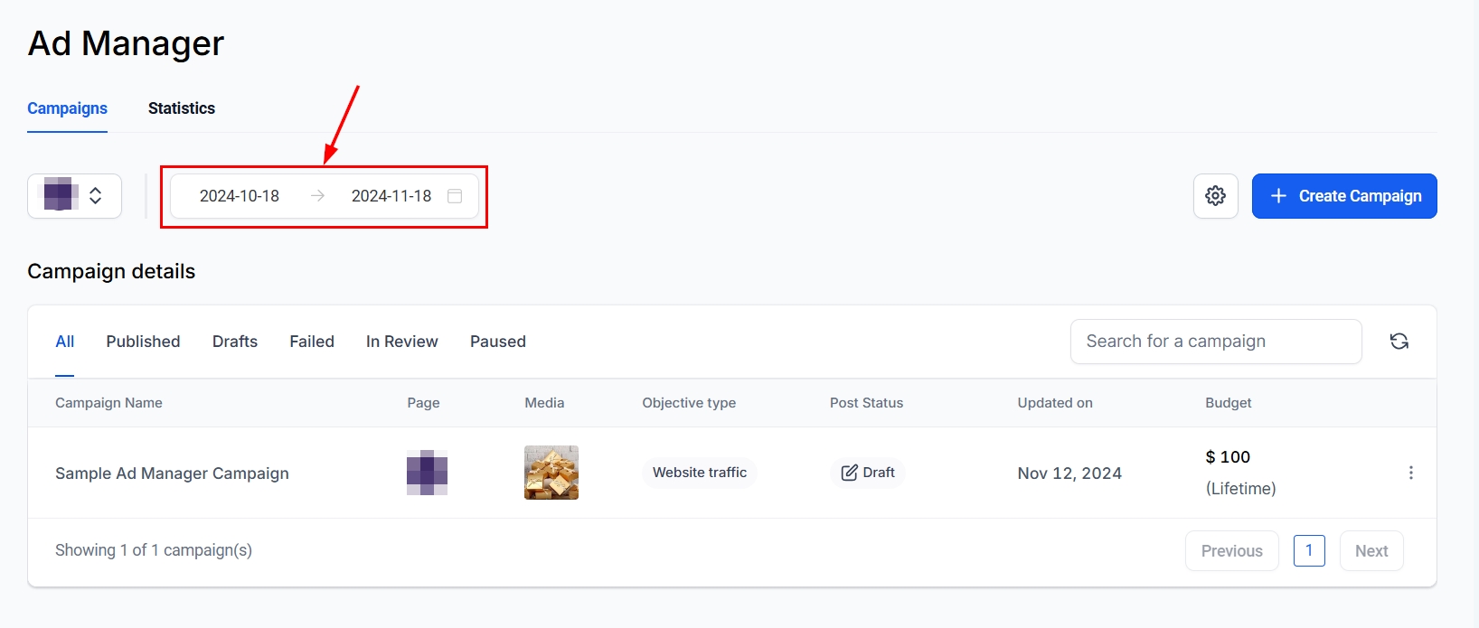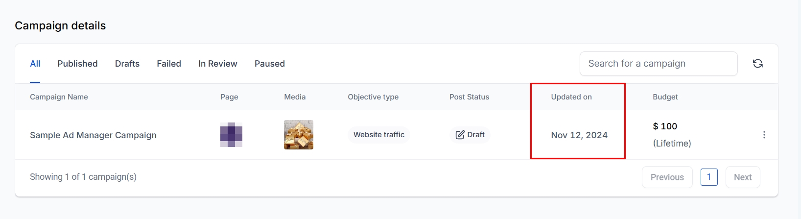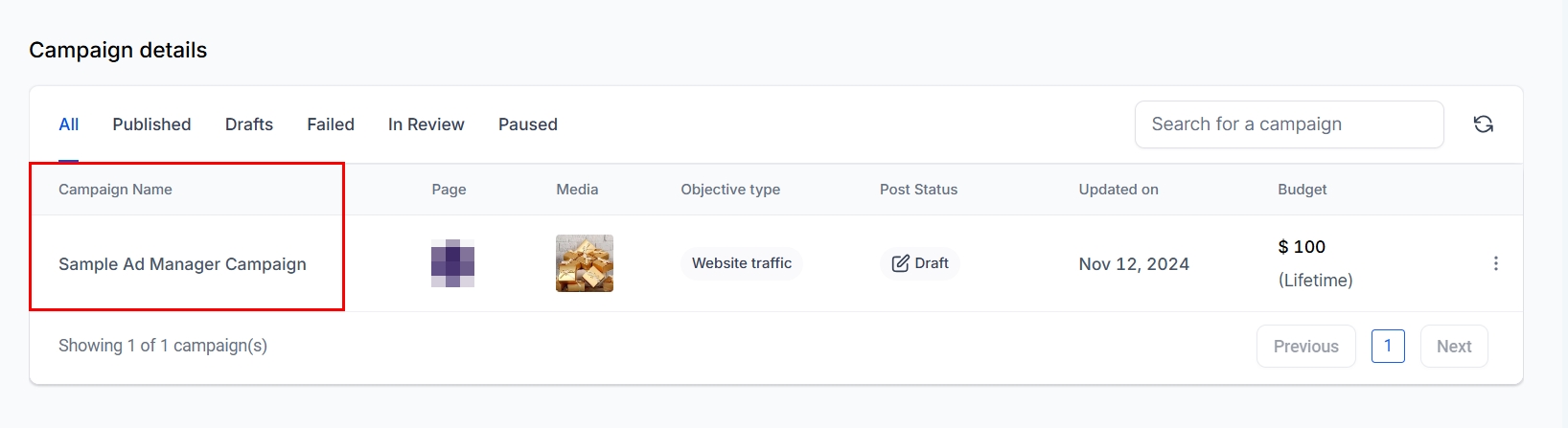 In this section, you can view the tabulated details of all your campaigns. Additionally, you can filter campaigns by status by selecting options such as Published, Drafts, Failed, In Review, or Paused.
