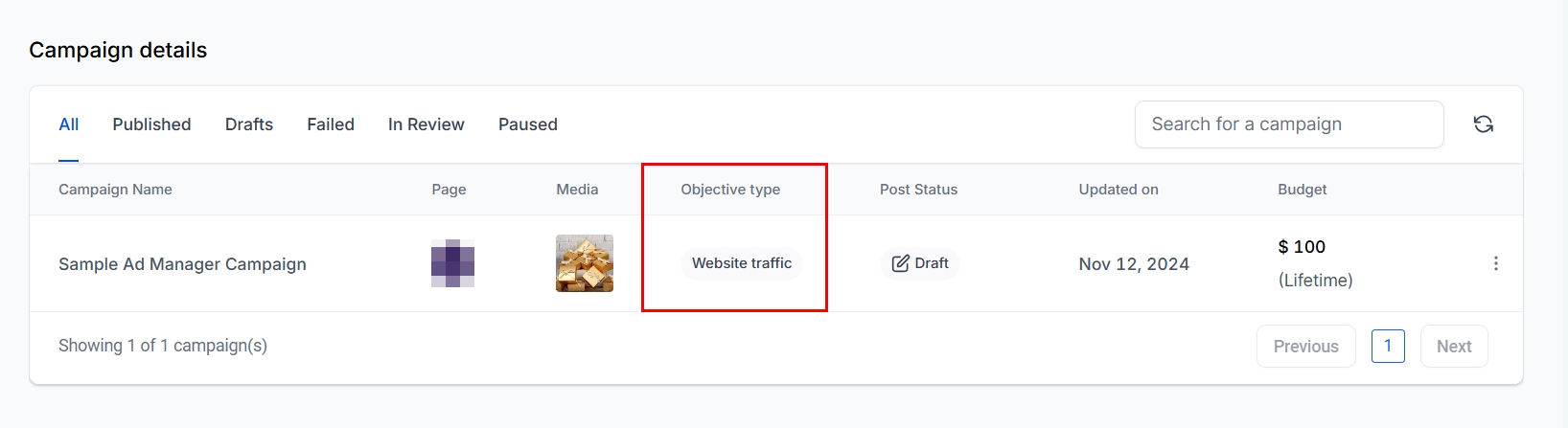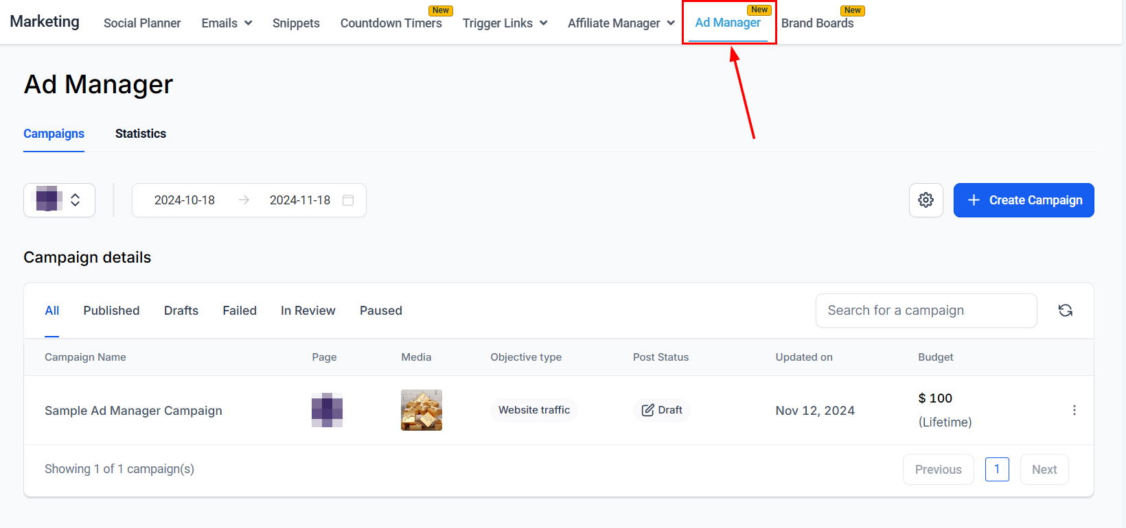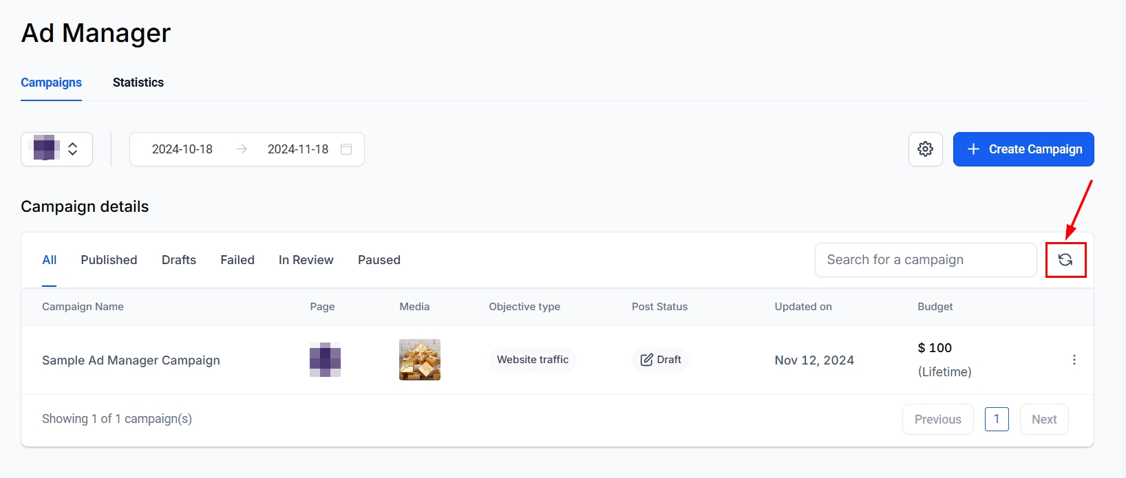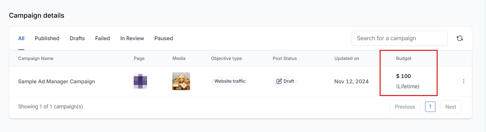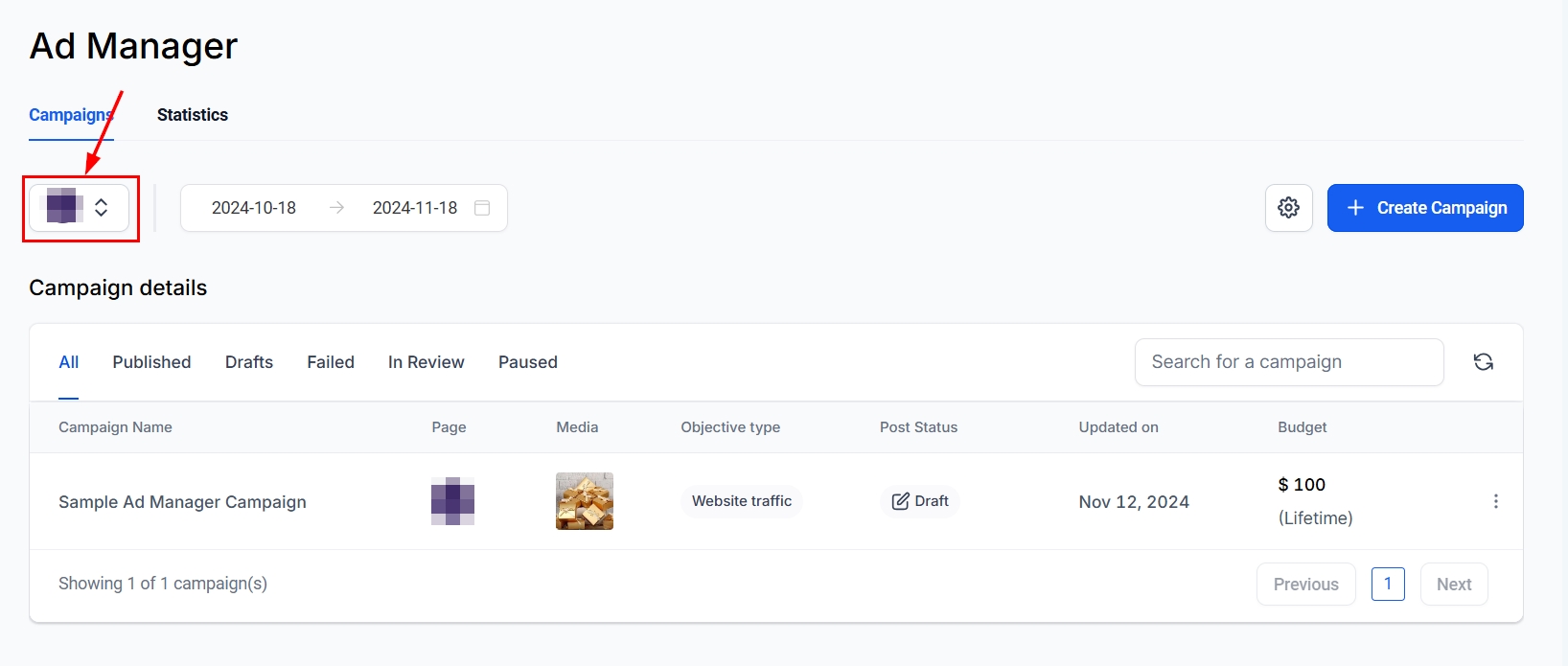 In this section, you can view the tabulated details of all your campaigns. Additionally, you can filter campaigns by status by selecting options such as Published, Drafts, Failed, In Review, or Paused.