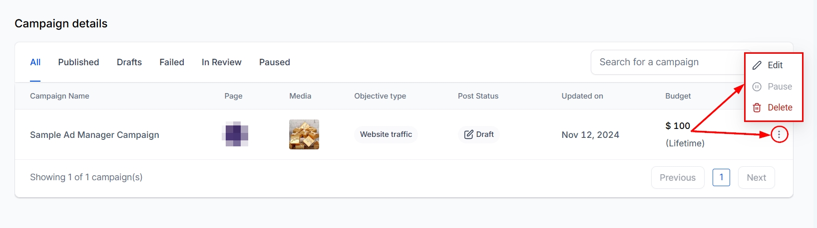 Modify the campaign settings by selecting the edit option, pause an active campaign, or delete the campaign using the three-dot actions menu associated with it.