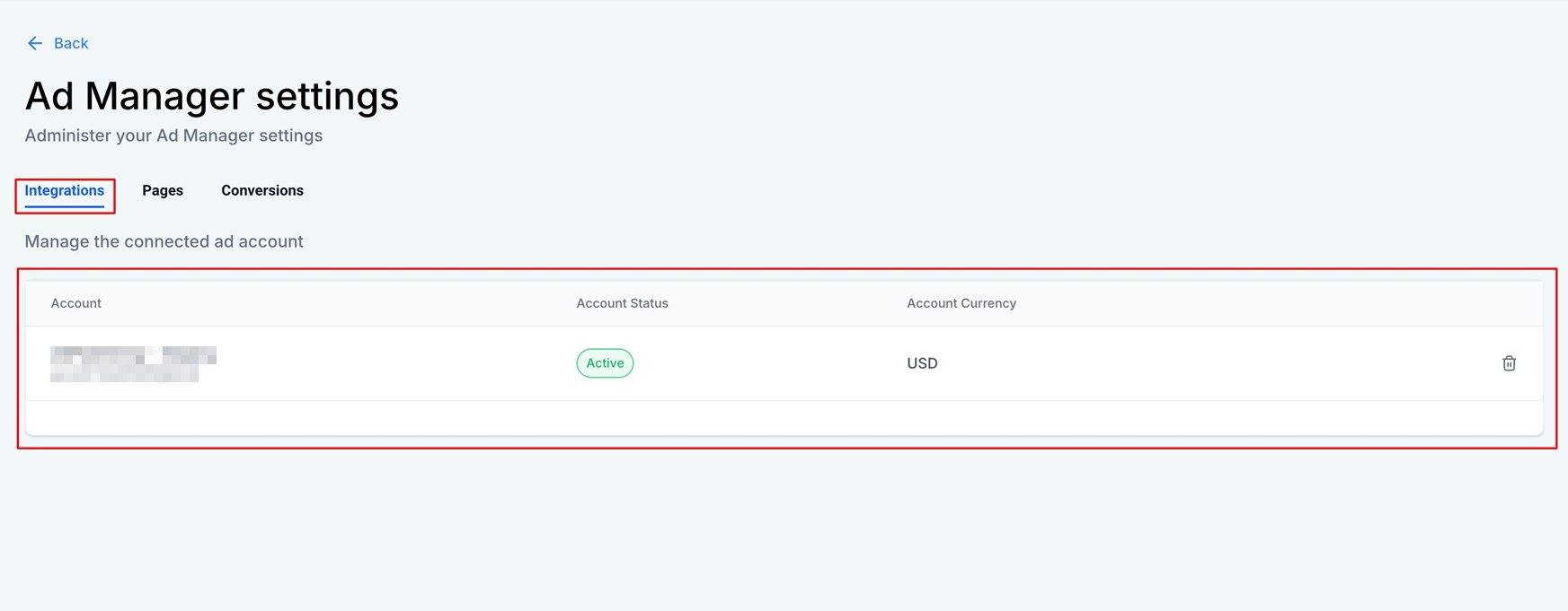 The Integrations tab displays the details of the Meta Ad account connected during the initial Facebook Ad Manager integration. Currently, Ad Manager supports the integration of a single Meta Ad account. However, future updates will allow for the addition of multiple ad accounts.