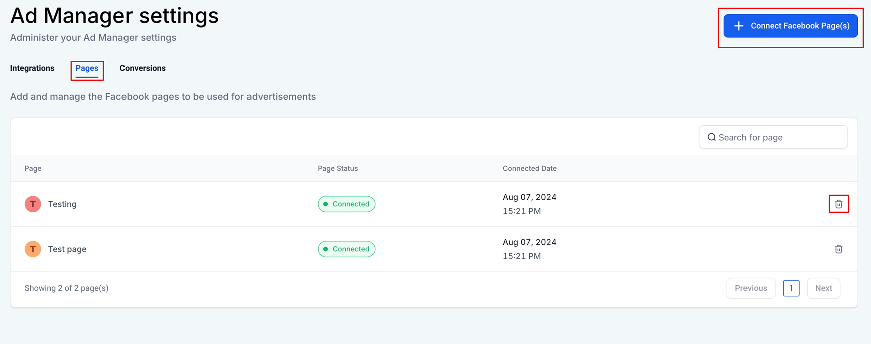 The Pages tab displays a list of all Facebook pages connected to Ad Manager. Users can add or delete pages by clicking the "Connect Facebook page(s)" or the delete button, respectively.