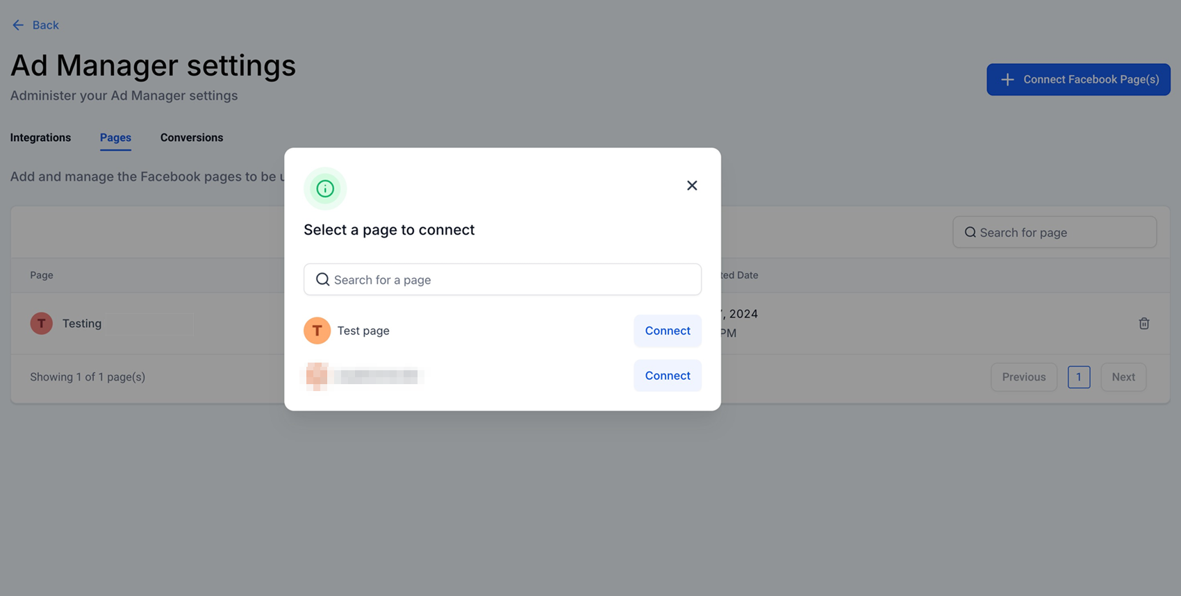 To connect a new page to Ad Manager, click the "Connect Facebook page(s)" button. A modal will open, displaying a list of Facebook pages associated with the connected Business Manager, allowing users to select the desired page.