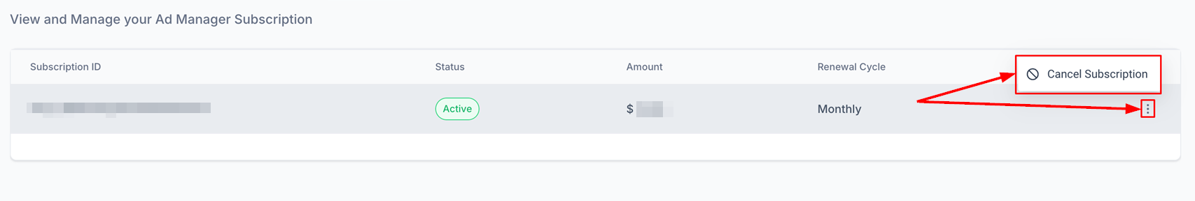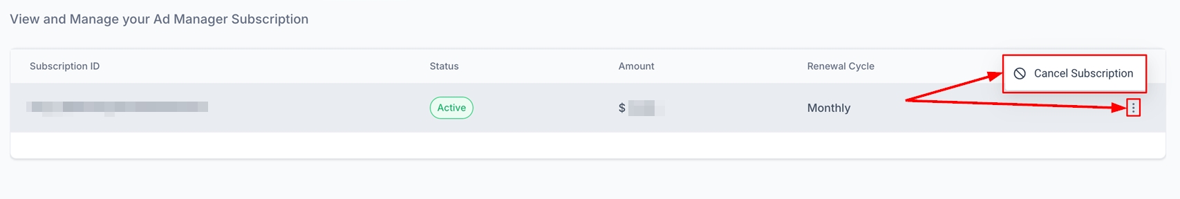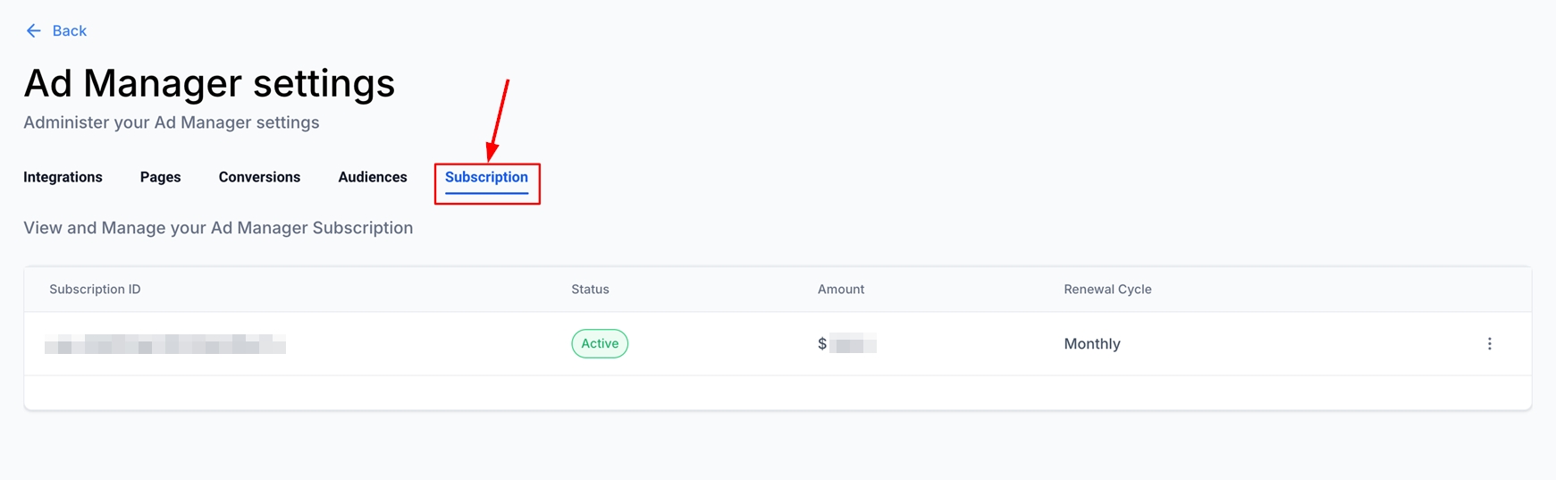 Within the Ad Manager settings, you will find a dedicated "Subscription" tab, located alongside other settings tabs. This tab provides essential information about your current subscription, including monthly charges, subscription ID, and an option to cancel the subscription if desired.