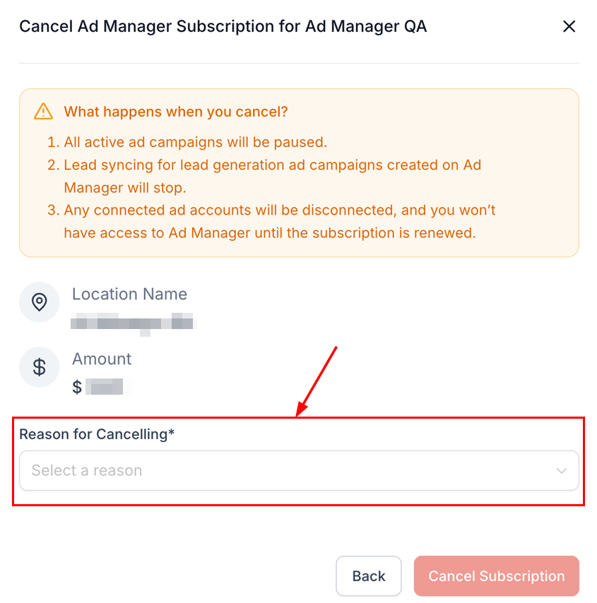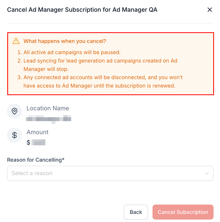 Any connected ad accounts will be disconnected, and you will lose access to Ad Manager until the subscription is renewed.