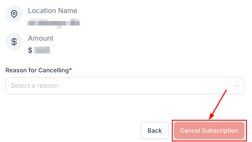 Once a reason is selected, the 'Cancel Subscription' button will become active. Click the button to finalize the cancellation, and a confirmation dialog will appear to notify you that your subscription has been canceled.