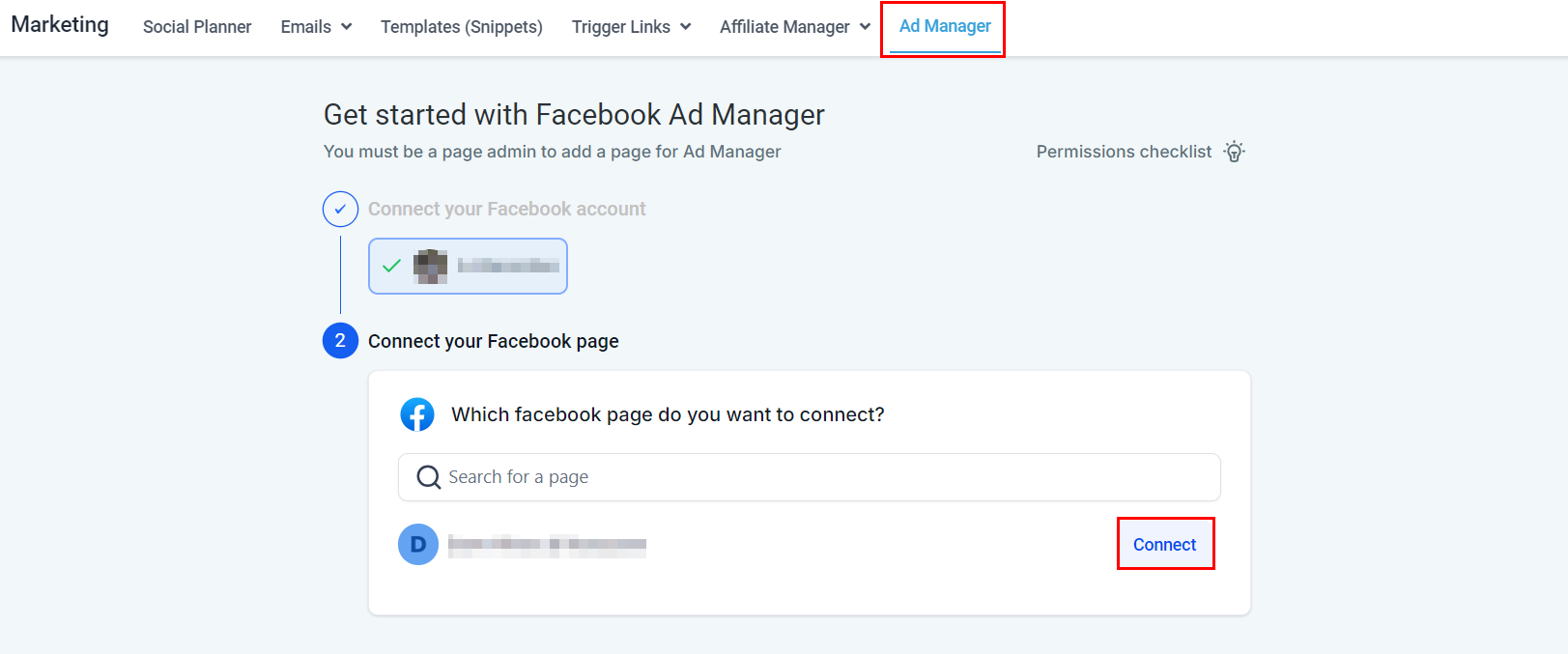 To start with Ad Manager, you must first connect your Facebook pages within the Marketing > Ad Manager section. Ad Manager supports the connection of several Facebook pages, allowing for comprehensive campaign management.