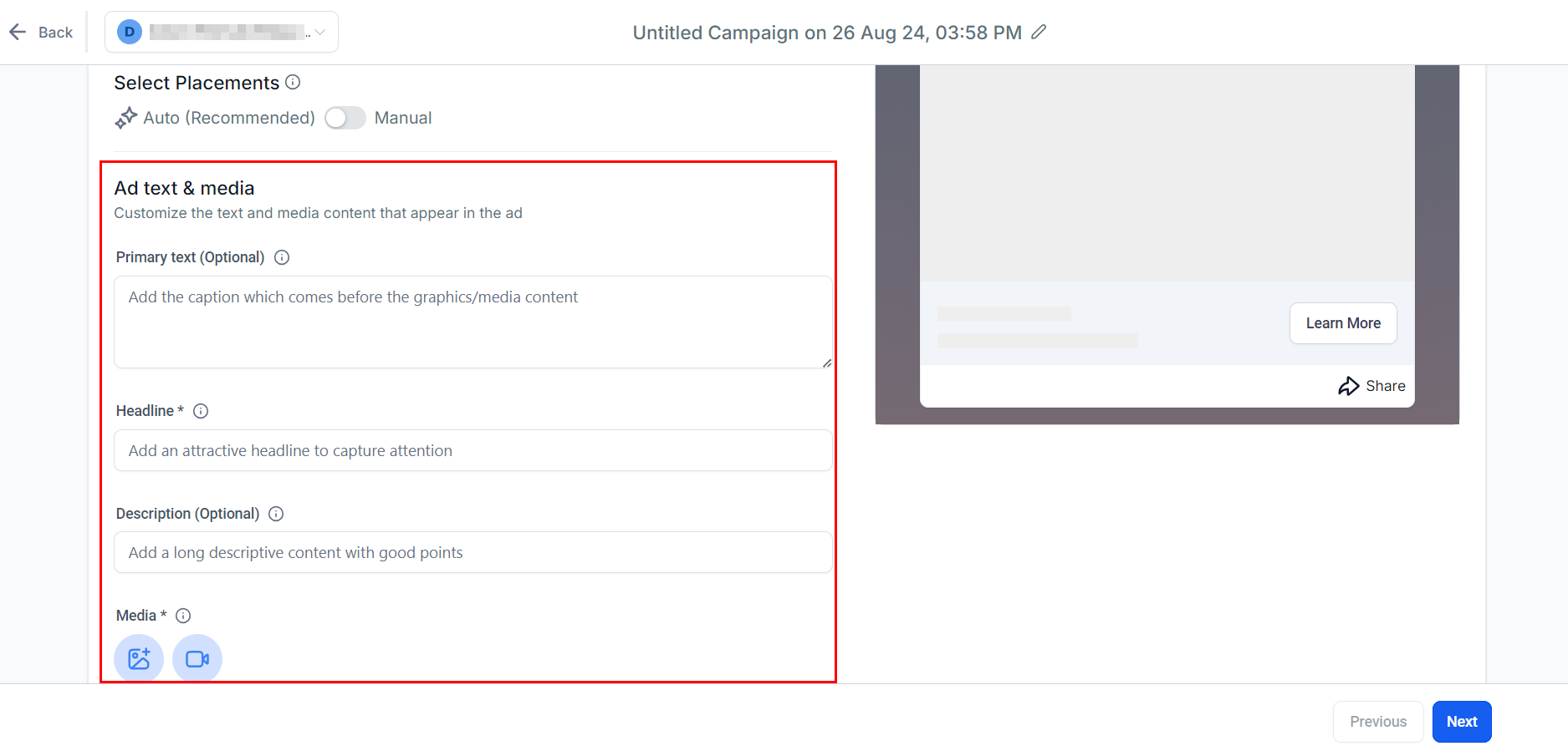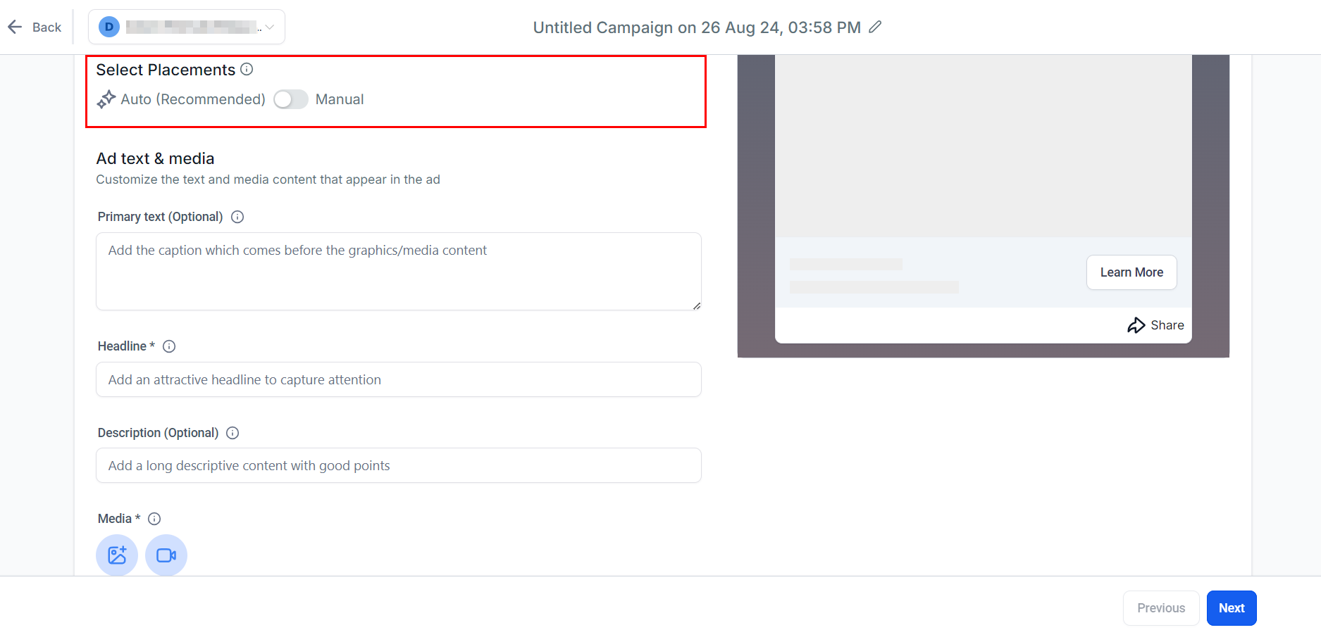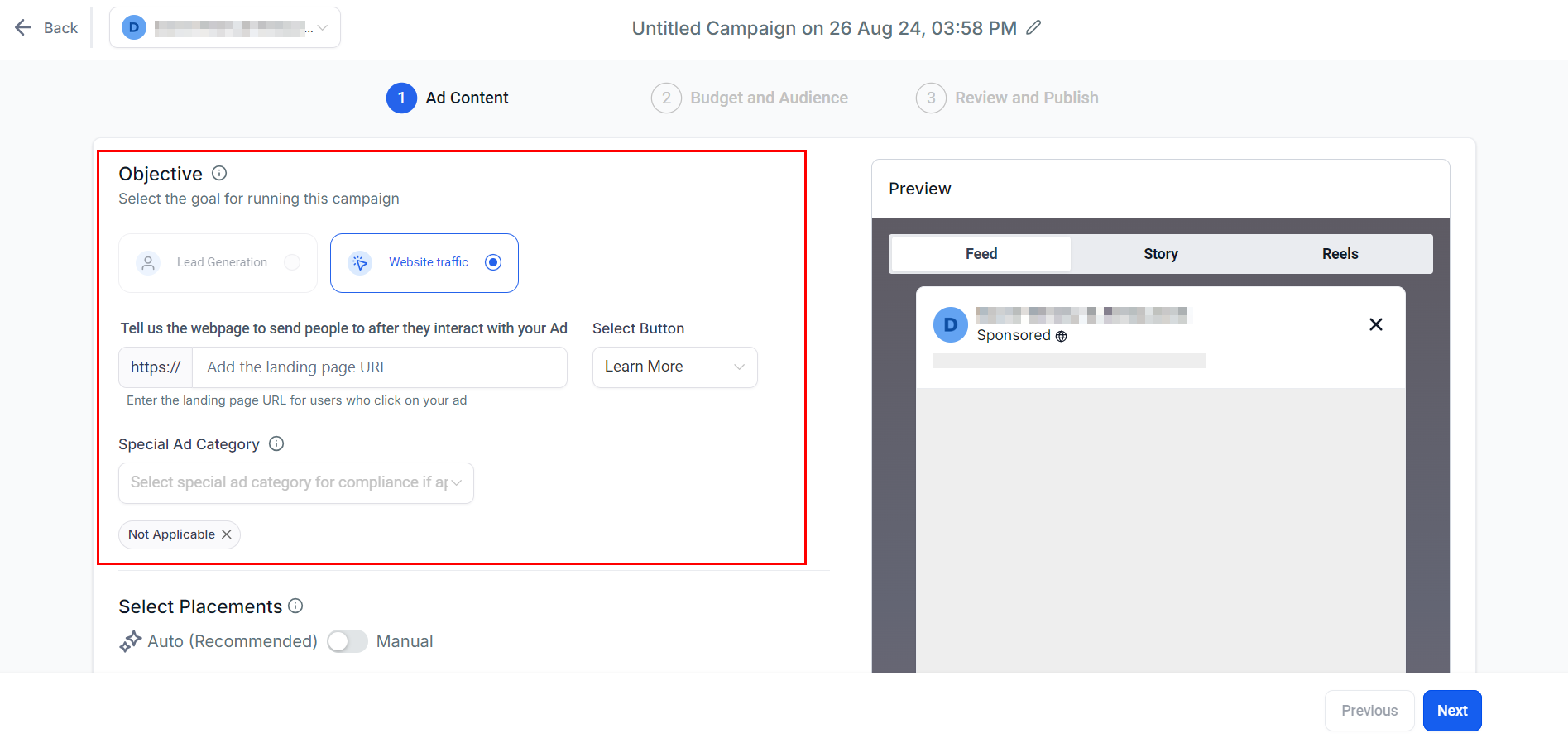 Placement: Placements determine where your ads will appear. You can opt for automatic placements, which maximize results across default placements based on your budget, or manual placements, where you select the specific locations for your ads, ensuring brand safety and optimization.